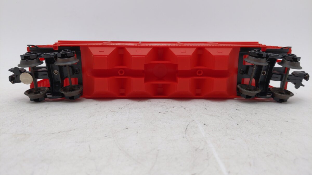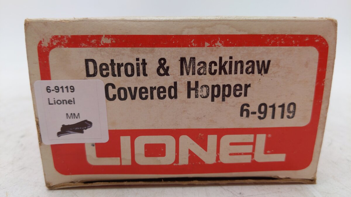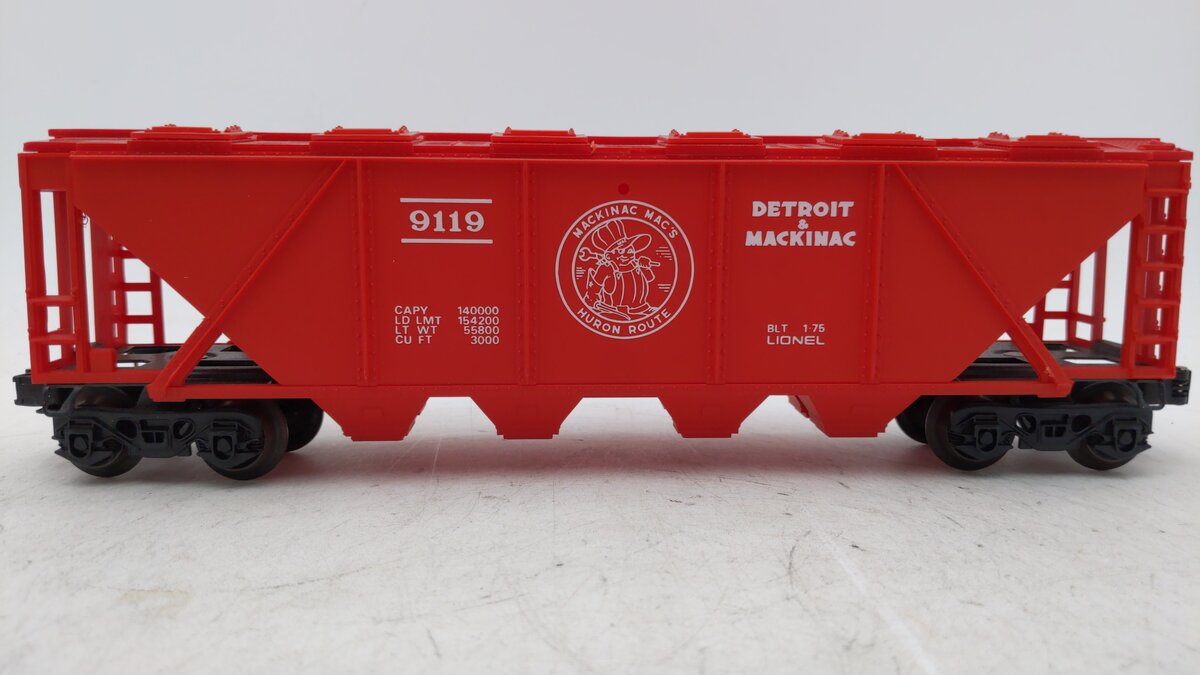 This is a Lionel 6-9119 O Gauge Detroit & Mackinac Covered Hopper from 1977. This hopper features plastic trucks, 12 opening roof hatches, operating knuckle couplers, metal wheels and axles.