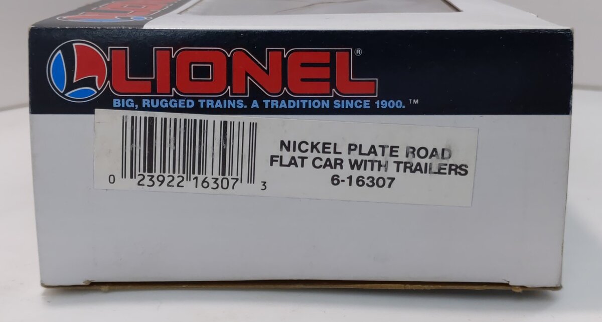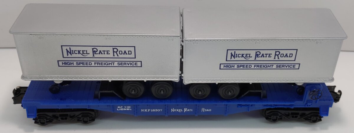 This is a Lionel 6-16307 O Gauge Nickel Plate Road Flatcar with Trailers from 1988. This flatcar features 2 removeable trailers, plastic trucks, operating knuckle couplers and metal wheels and axles.
