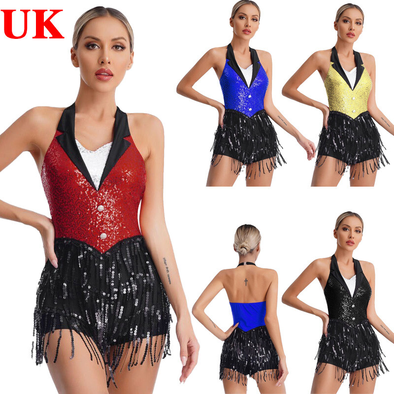 Women’s sleeveless dance leotard with shiny sequins and tassels to create an eye-catching effect and brighten up any performance.