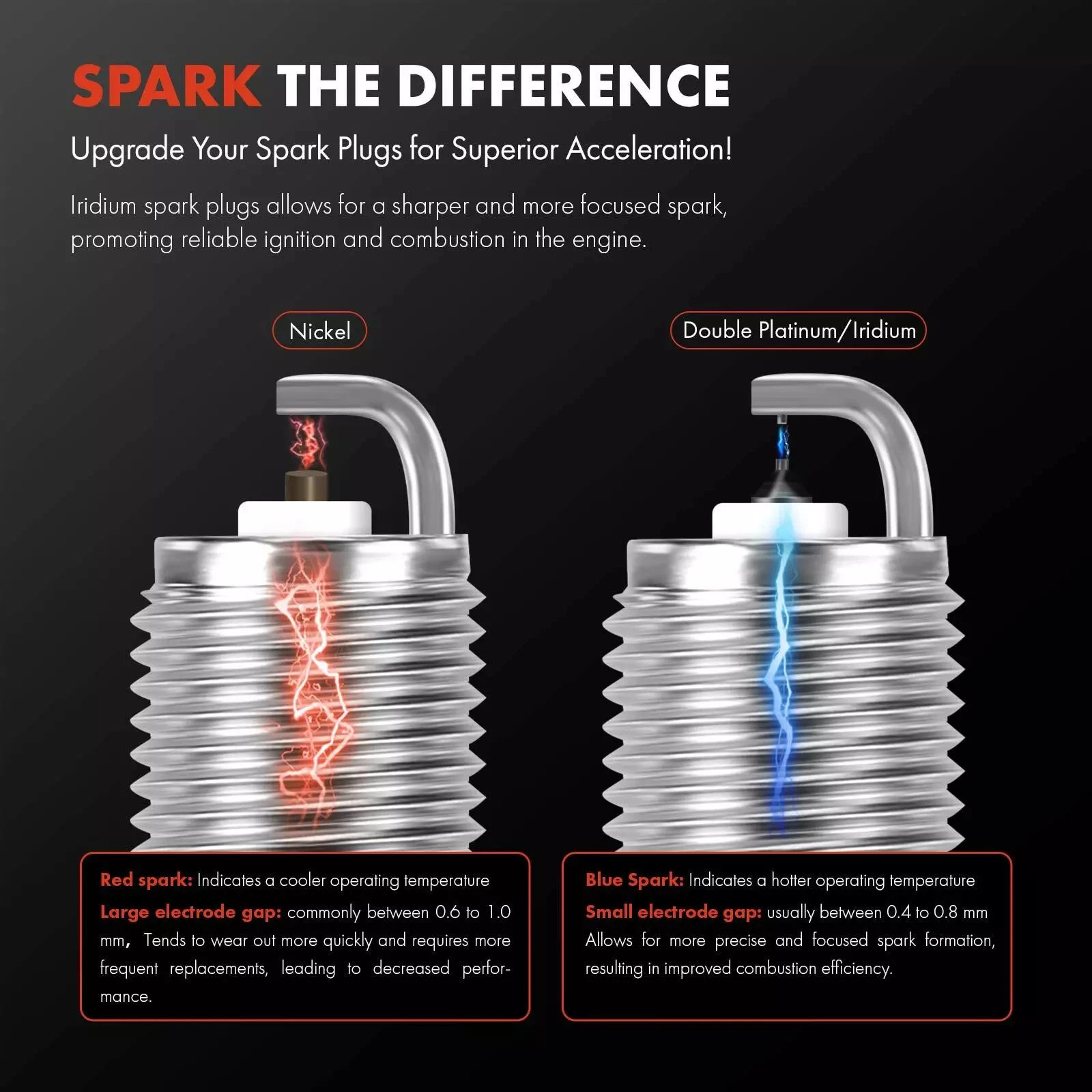 ♚When the electrode gap is between 0.4 and 0.8 millimeters, more precise and concentrated sparks can be formed, improving combustion efficiency.