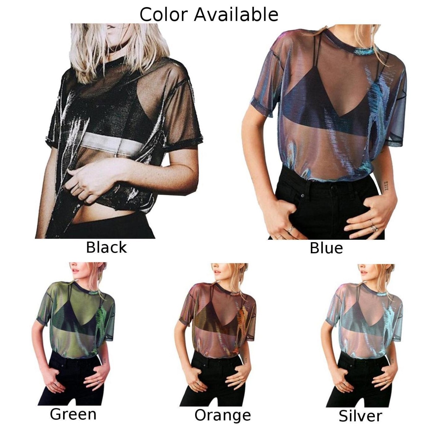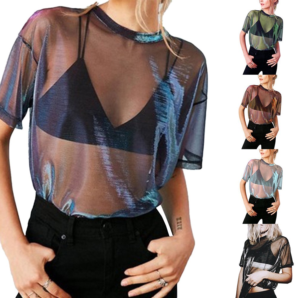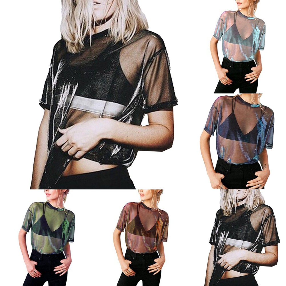 * Caractéristiques de l'article : manches courtes pour femmes, transparent, maille, brillant, haut transparent, t-shirt, chemisier décontracté, vêtements de club