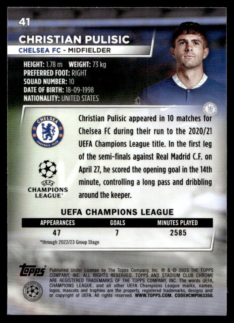 2022 Stadium Club Chrome UEFA Competitions Christian Pulisic Chelsea FC #41