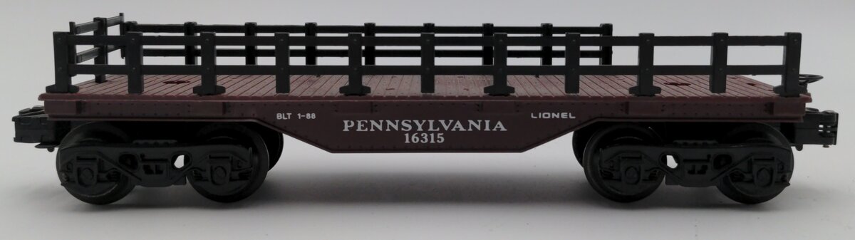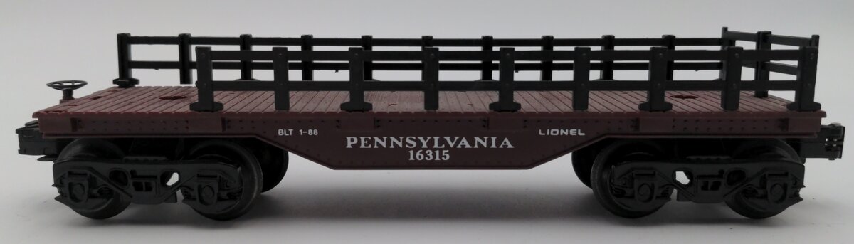 This flatcar features removeable fences and a removeable crate load, durable plastic construction, plastic trucks, operating knuckle couplers, metal wheels and axles.