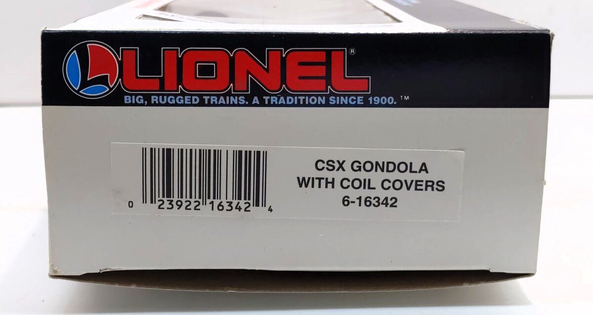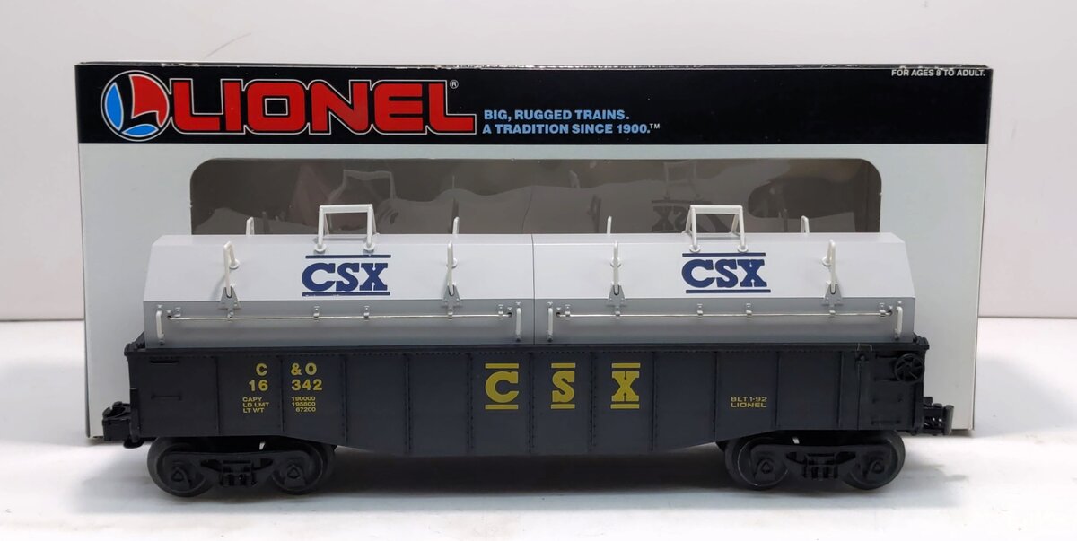 Here is a Lionel 16342 O Gauge CSX Gondola with Coil Covers. This car features a plastic construction with operating couplers and removeable coil covers.