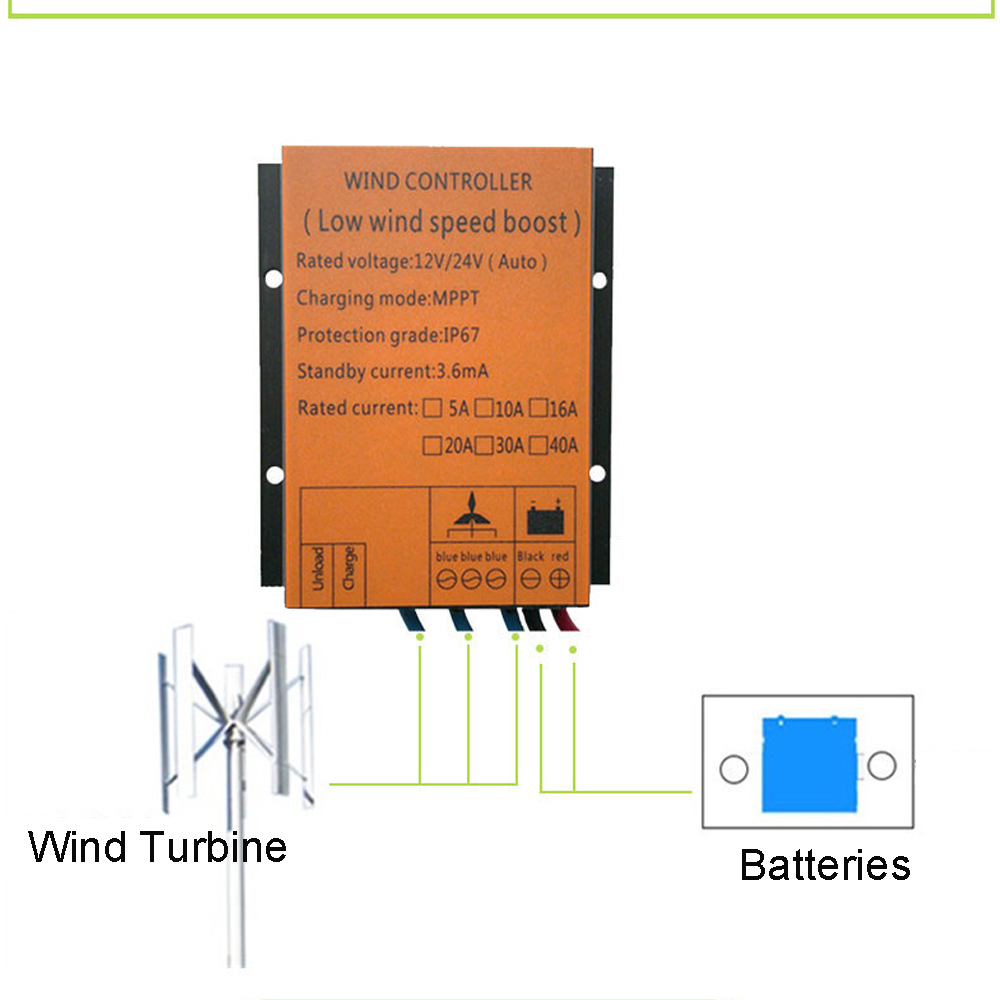 Schutz: Überspannungsschutz der Batterie, Strombegrenzung des Windgenerators, Bremse des Windgenerators, Geschwindigkeitsschutz
