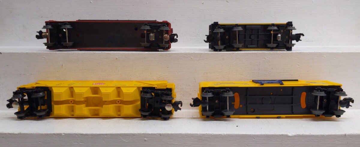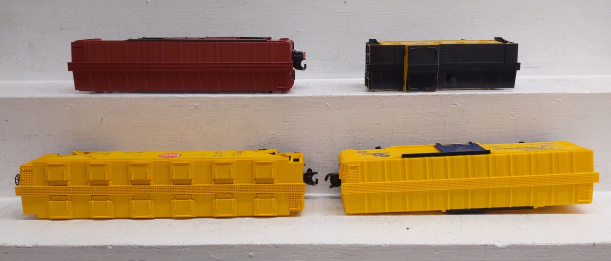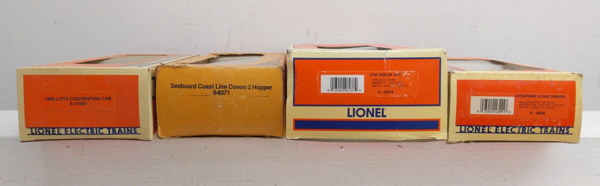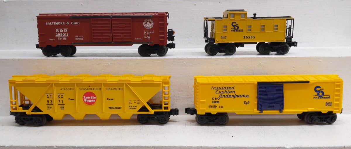 Here we have Lionel 6-16555 Chesapeake & Ohio Caboose, Lionel 6-9371 O Gauge Atlantic Sugar Refineries Lantic Sugar Hopper, Lionel 6-26276 O Chesapeake & Ohio Boxcar #23296 and Lionel 6-17882 O Gauge LOTS-1990 Baltimore & Ohio Double Door Boxcar w/ ETD. Each car features die-cast metal or plastic trucks, metal wheels and axles, and operating knuckle couplers.