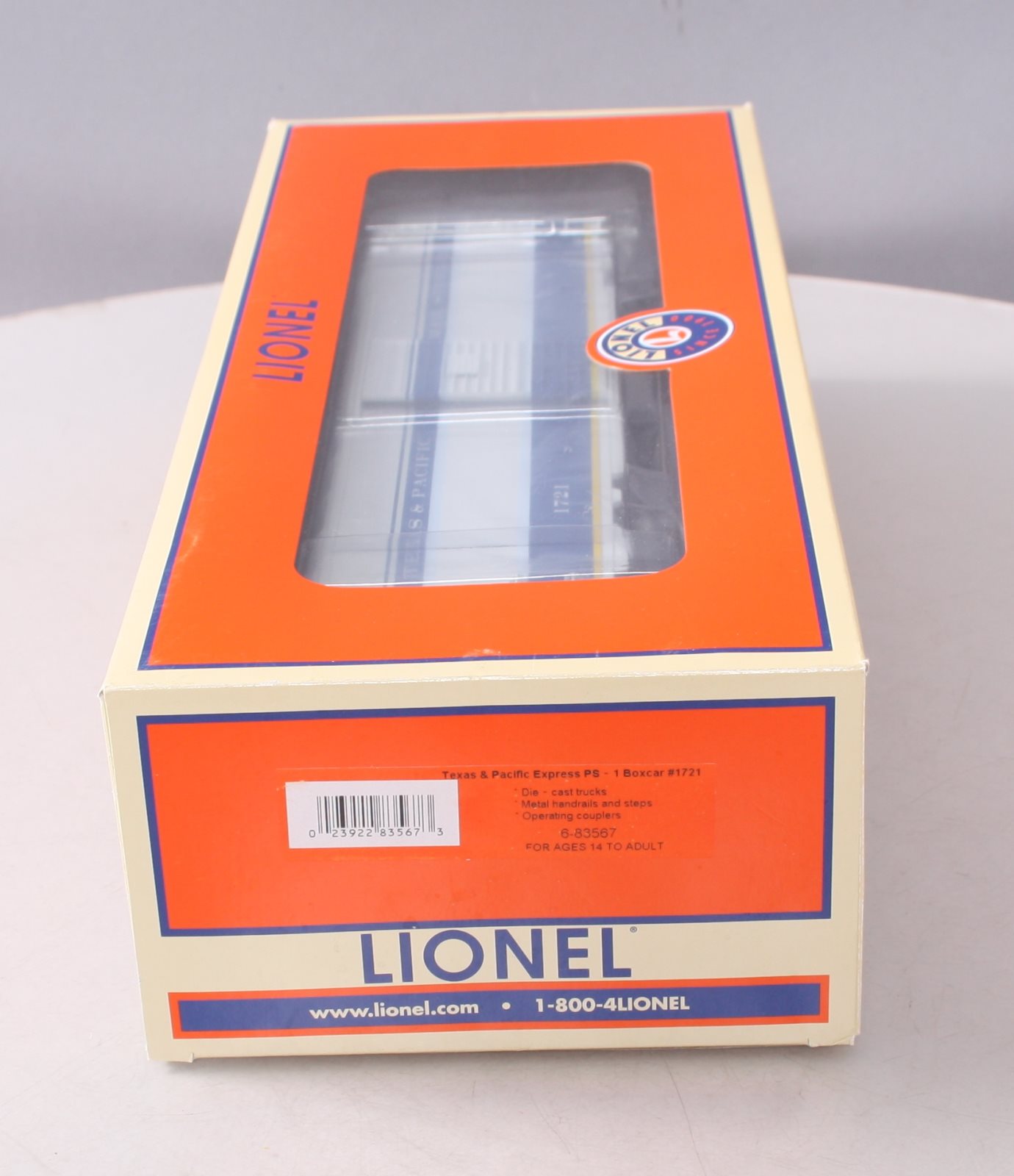 This is a Lionel 6-83567 Texas & Pacific PS-1 Express Boxcar #1721. Features: Die-cast metal sprung trucks and operating couplers, Easily converted to scale couplers, Separately applied metal underframe details, Opening doors.