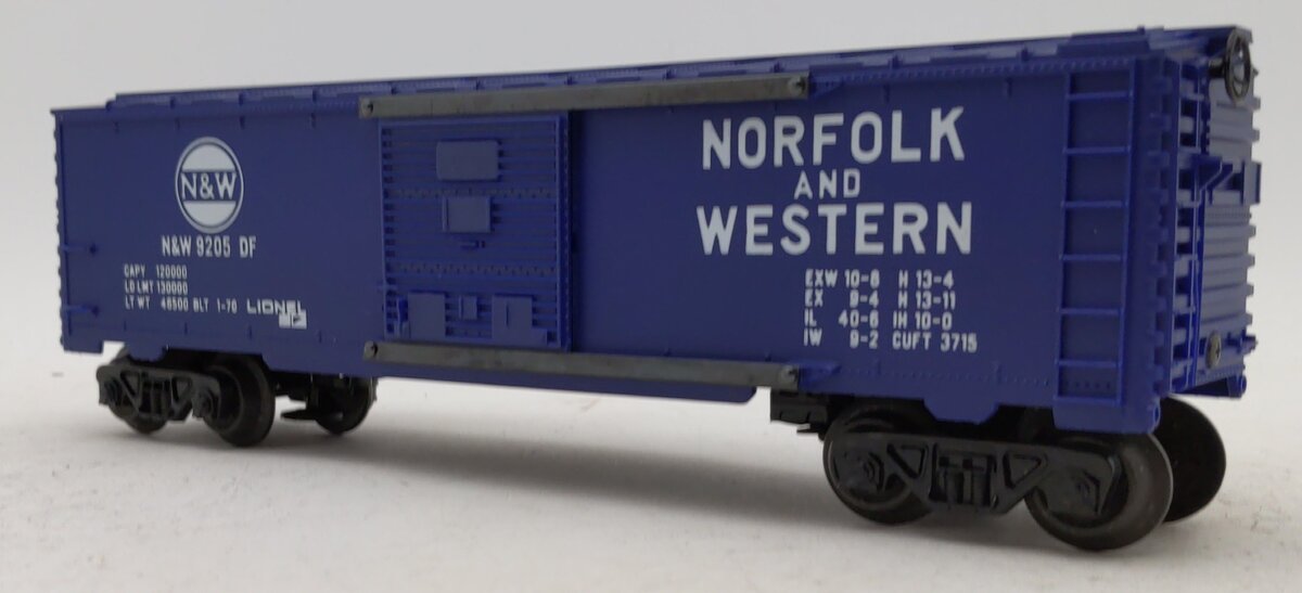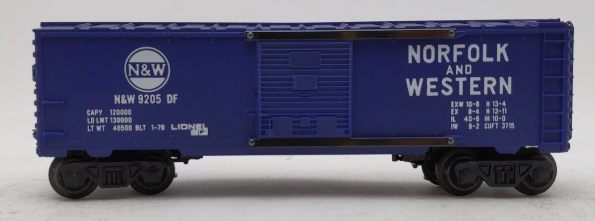 Here is a Lionel 6-9205 O Gauge Norfolk & Western Boxcar. It features a plastic shell, plastic trucks and operating couplers, metal wheels and axles, and sliding doors.