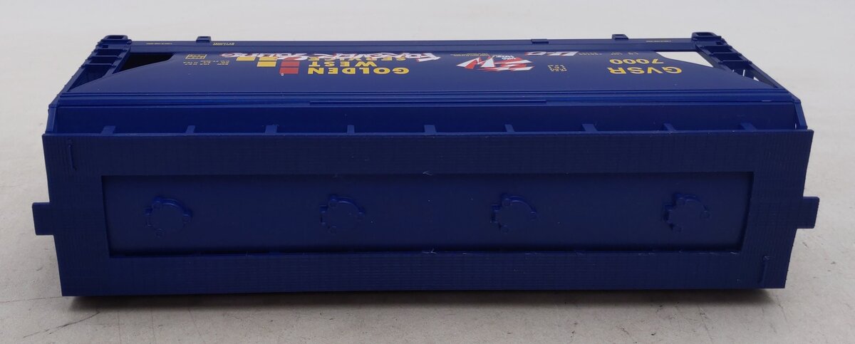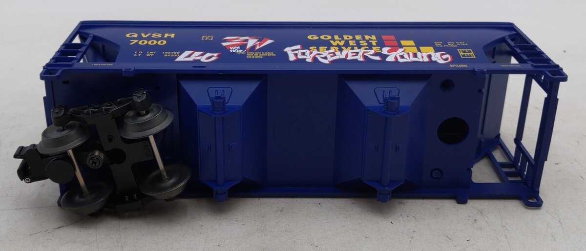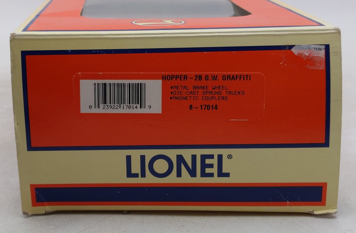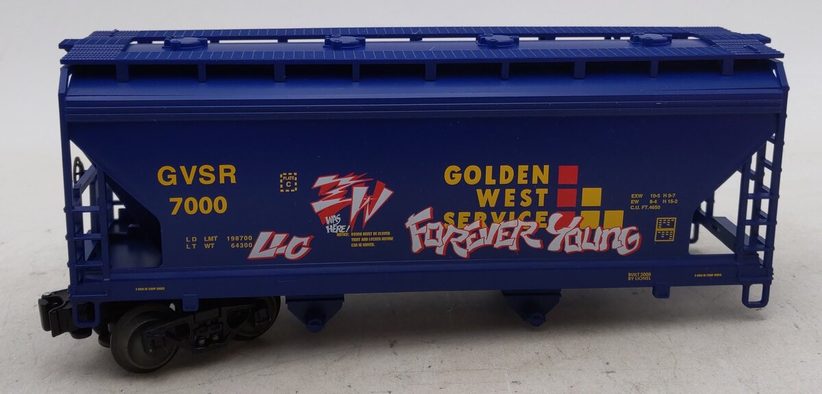 Here is a Lionel 6-17014 O Gauge Golden West Graffiti Covered 2-Bay Hopper #7000. This unusual car has factory-applied graffiti markings to simulate the look often seen on real freight cars. It also features die-cast metal sprung trucks, die-cast metal operating knuckle couplers, and metal wheels and axles.