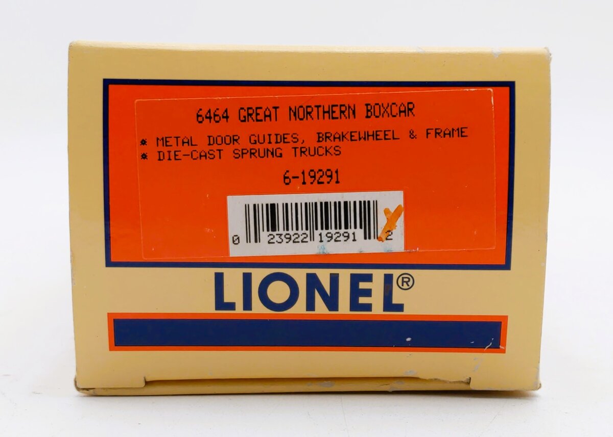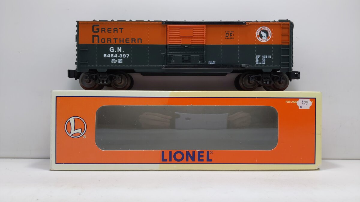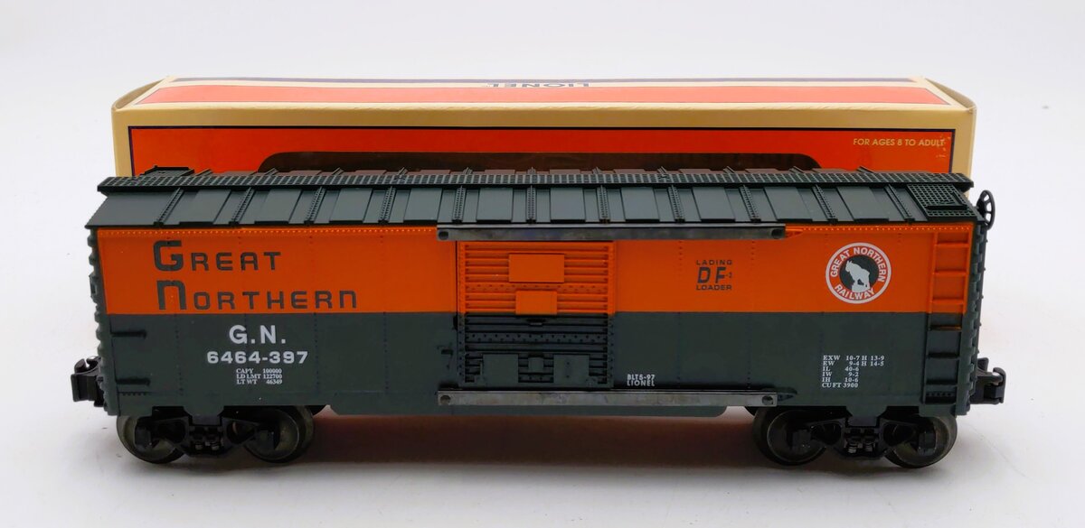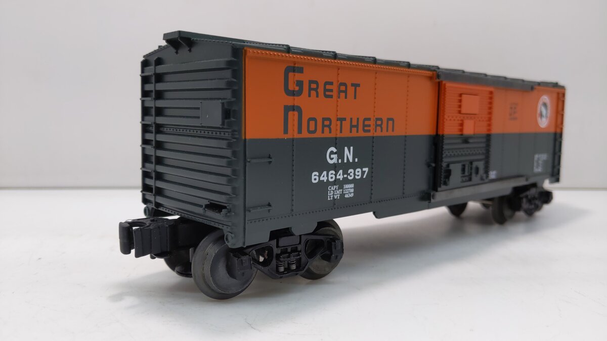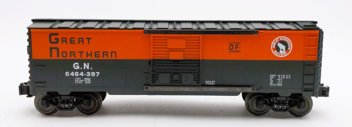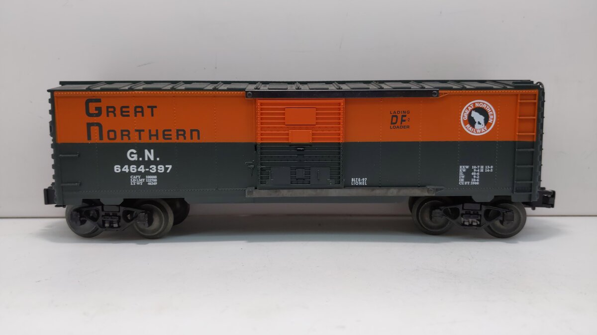 Here is a Lionel 6-19291 O Gauge Great Northern Boxcar #6464-397. This boxcar features a durable plastic construction, sliding doors, die-cast metal sprung trucks, die-cast metal operating knuckle couplers, metal wheels and axles, and attractive decoration.