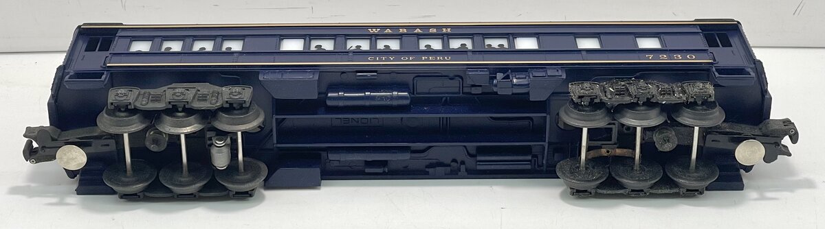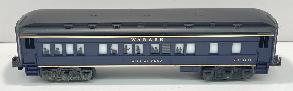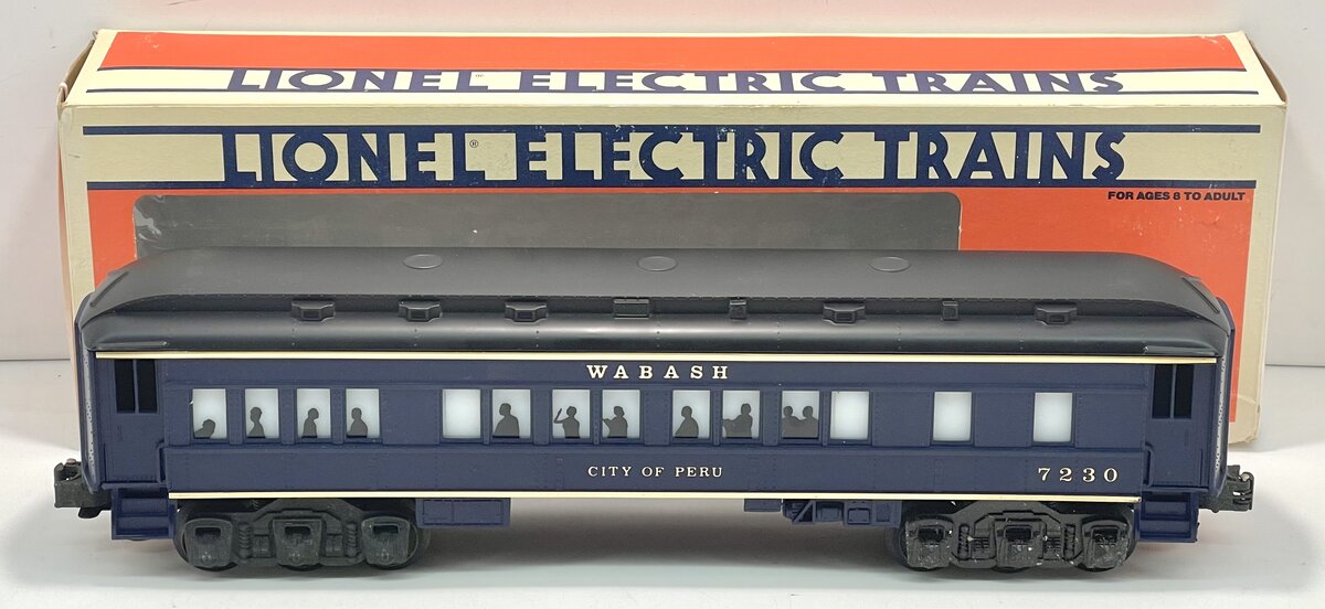 Here is a Lionel 6-7230 O Gauge Wabash "City of Peru" Passenger Car. This car is from the Wabash 'Fallen Flags' Set from 1986. It features a plastic body, an illuminated interior with passenger silhouetted windows, die-cast 6-wheel trucks with operating metal couplers, and it is 12 inches long. This was the only passenger train in the Fallen Flags series. The full set includes the 8610 Wabash 4-6-2 Steam Locomotive and the 7227-7232 Passenger Cars.