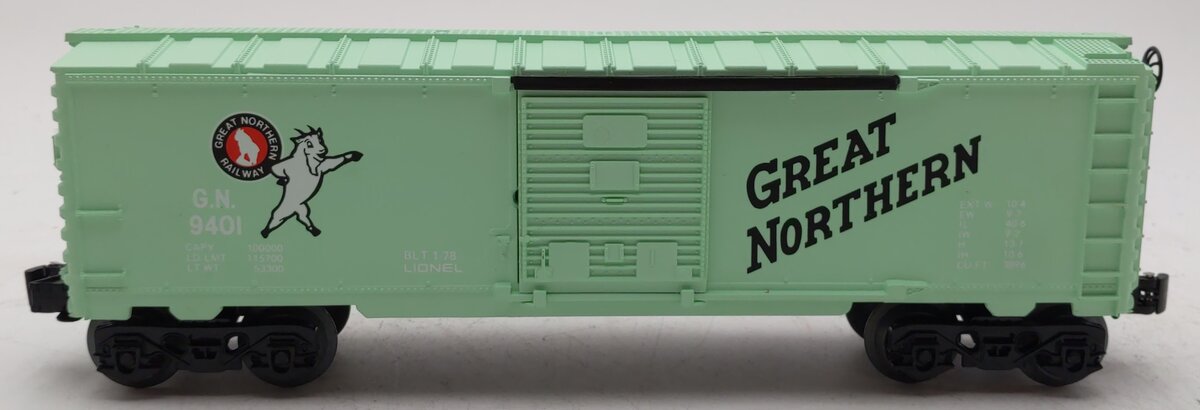 Here is a Lionel 6-9401 O Gauge Great Northern Boxcar made in 1978. This car features a plastic construction with sliding doors, metal wheels and axles, plastic trucks, and operating knuckle couplers.