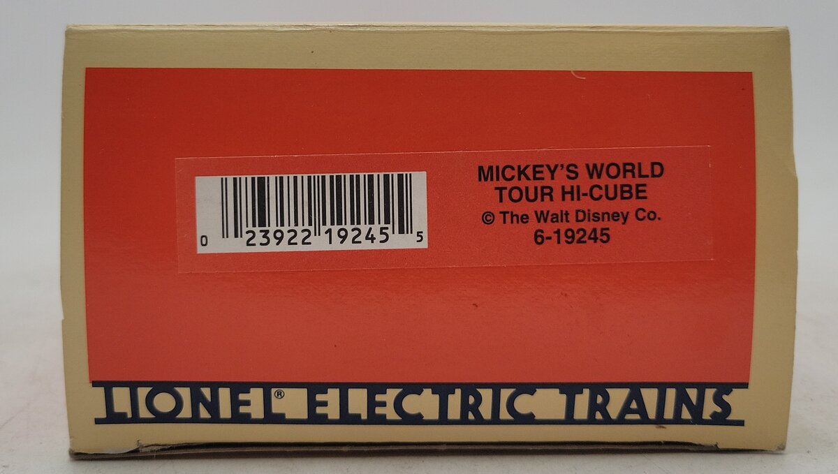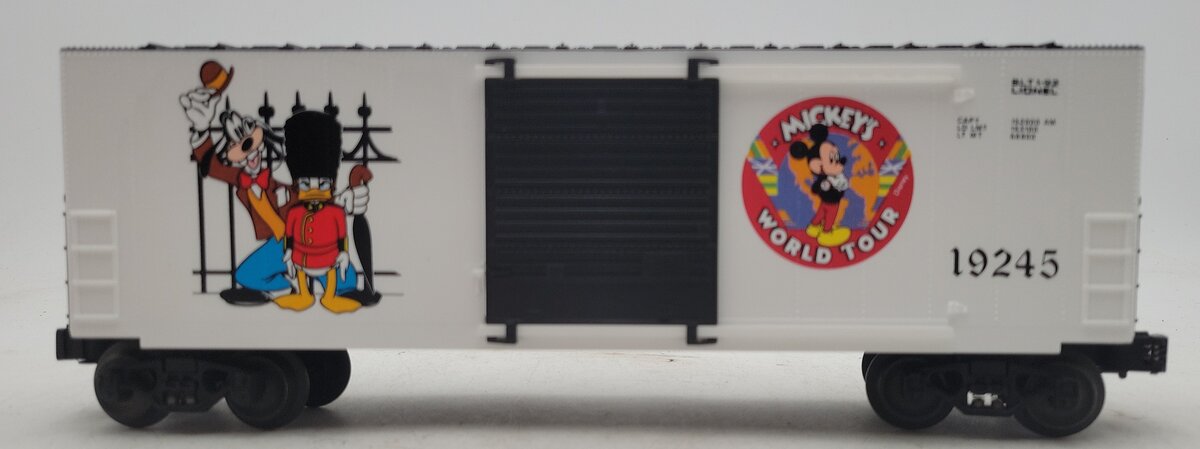 Here is a Lionel 6-19245 O Gauge Disney Mickey‘s World Tour Hi Cube Boxcar. This boxcar features sliding doors, die-cast metal sprung trucks, die-cast metal operating knuckle couplers, metal wheels and axles.