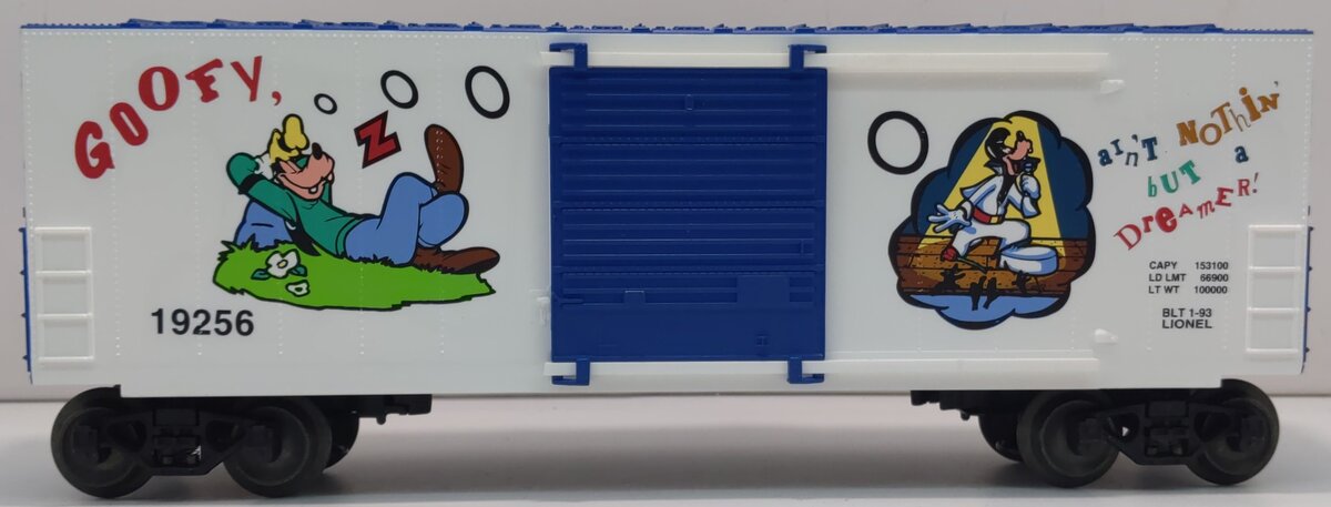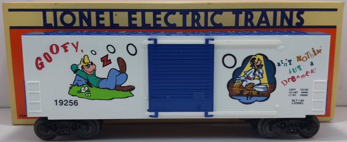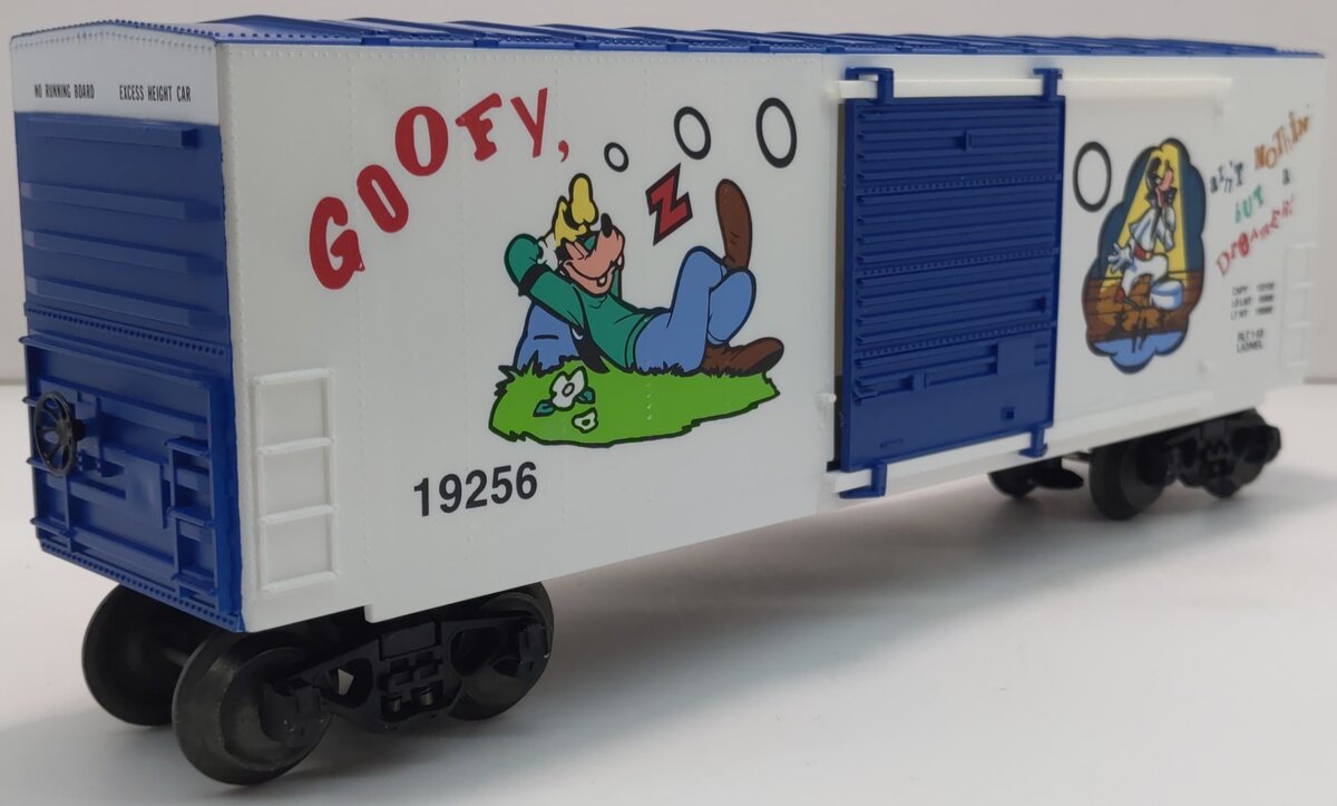 Here is a Lionel 6-19256 O Gauge Disney Goofy Hi-Cube Boxcar. This boxcar features sliding doors, die-cast metal sprung trucks, die-cast metal operating knuckle couplers, metal wheels and axles.