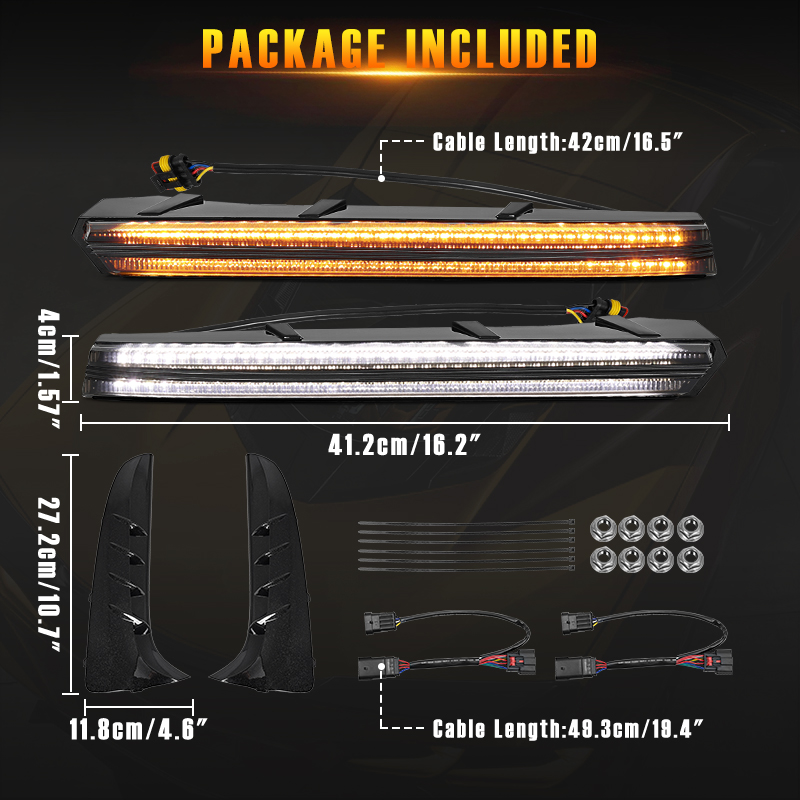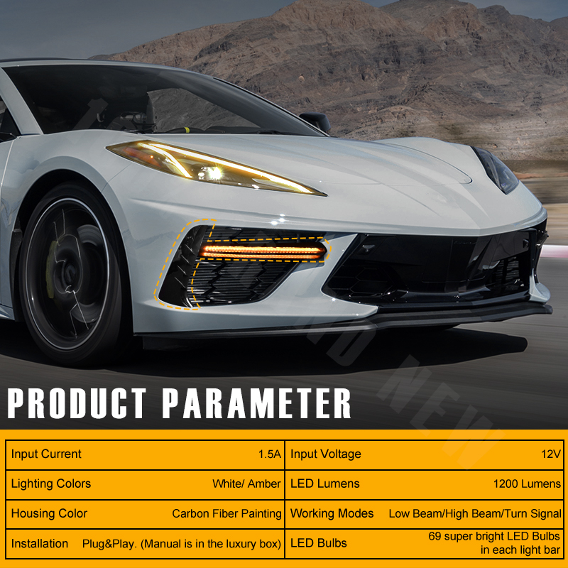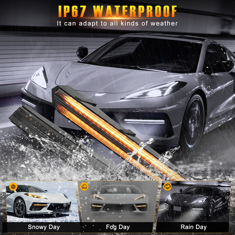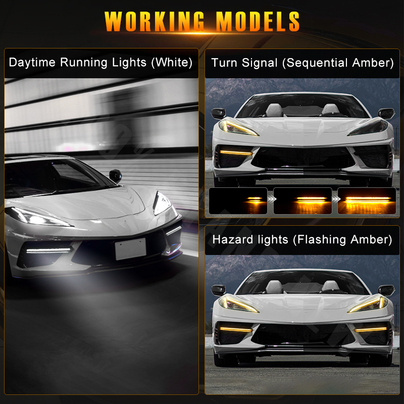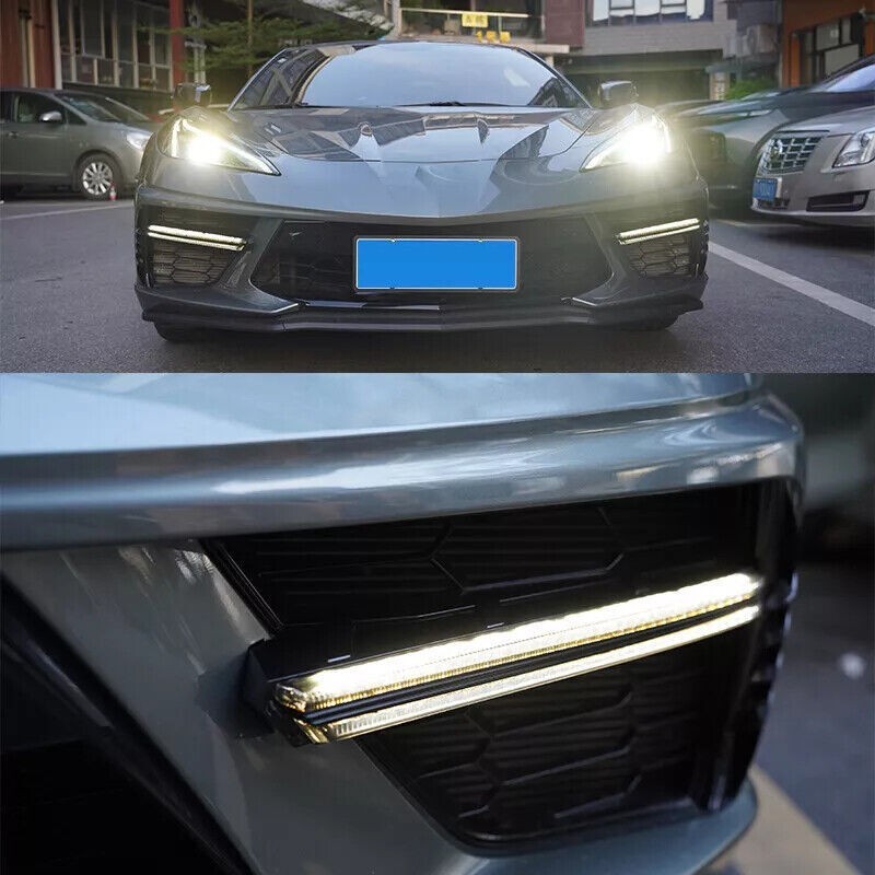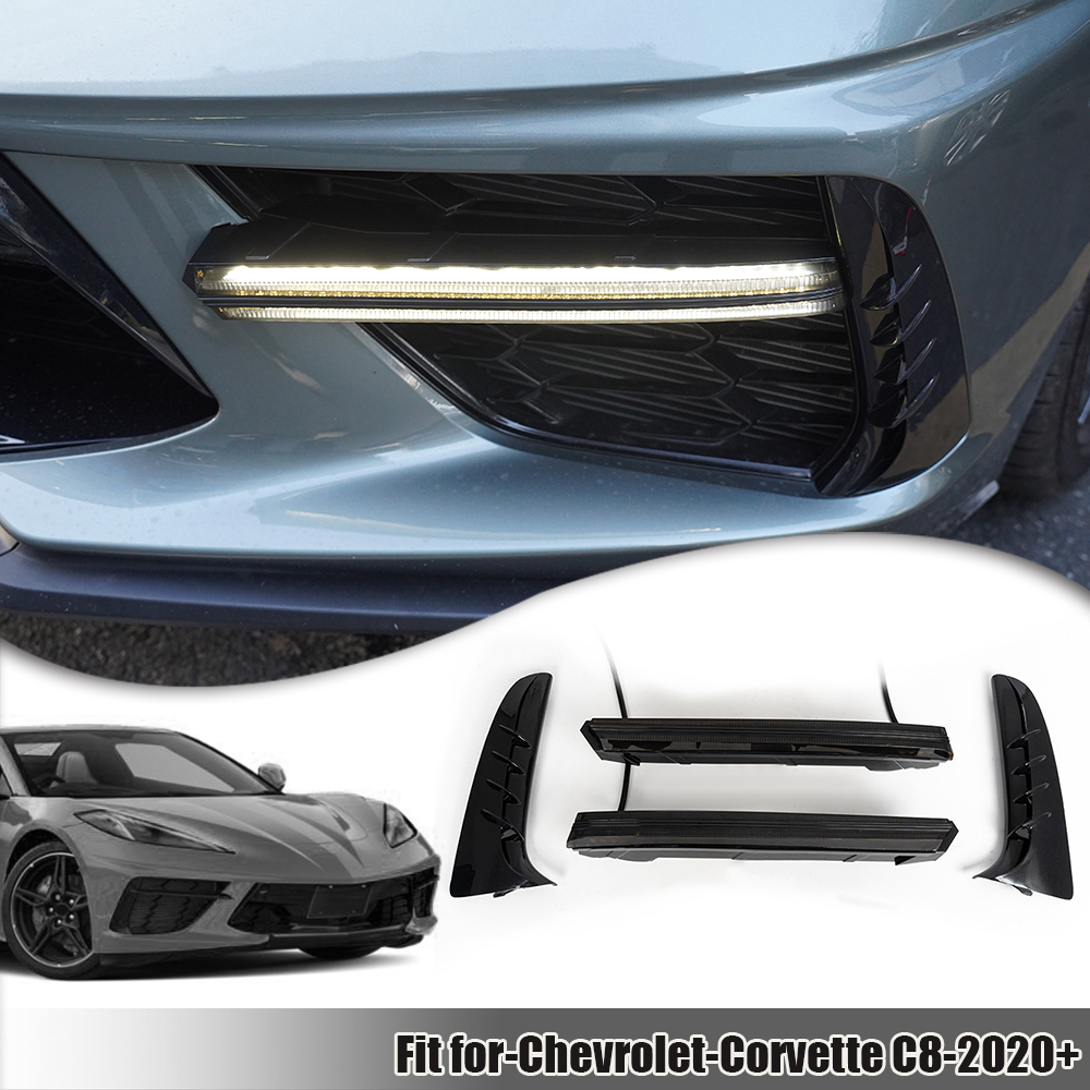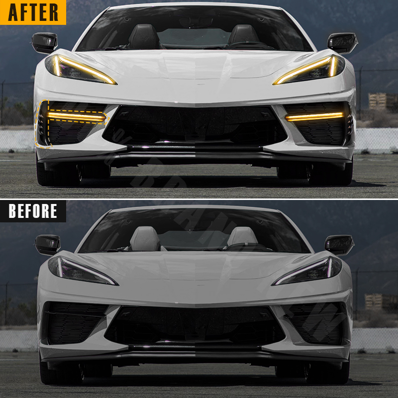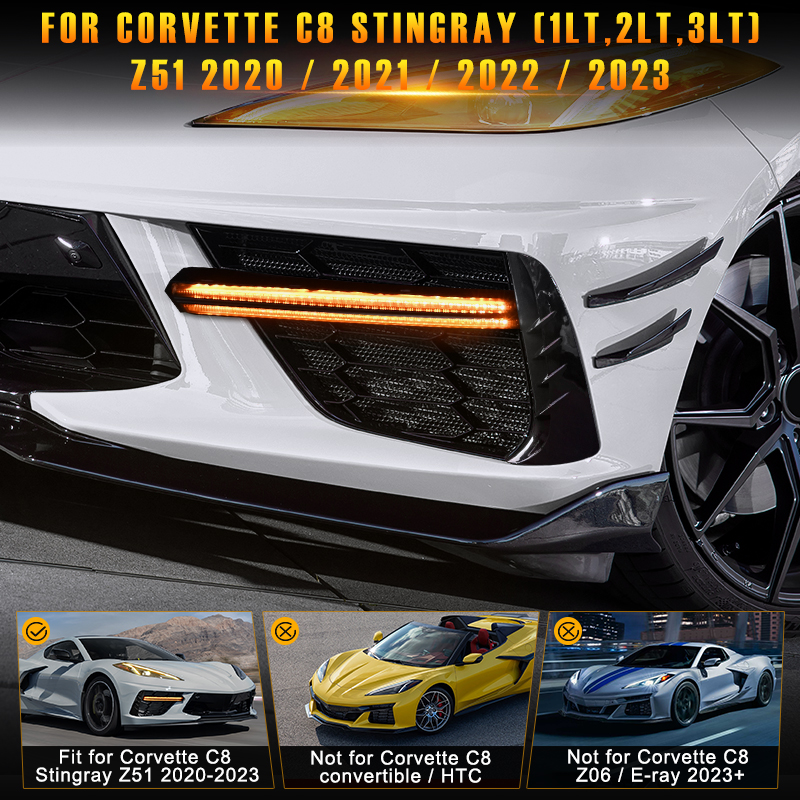 The LED grille bezel light bars fit for Corvette C8 Stingray (1LT, 2LT, 3LT) Z51 2020-2025,not fit forCorvette C8 Z06 HTC (Please note this product is designed for OEM headlights & not designed to be used with any aftermarket headlight modifications), Increase visibility for yourself and others with these dual function, A smoked gloss black lens is molded into a custom grille bezel for a OEM like fitting piece