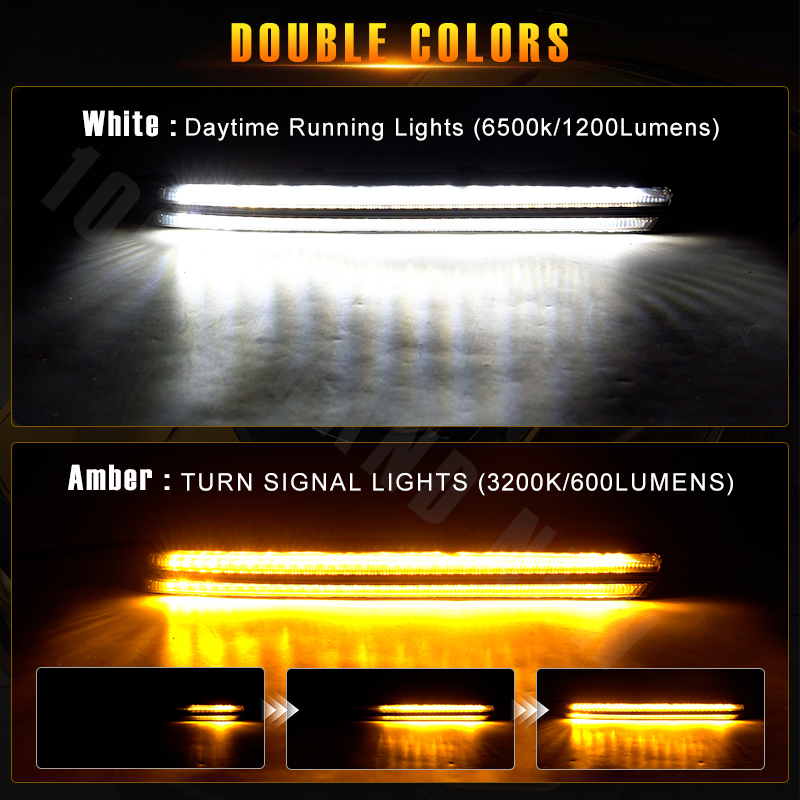 The LED grille bezel light bars features a total of total of 69 LEDs, including 69 daytime running lights, 69 turn signals/dual flashing lights. The DRL's have an output of 600 Lumens with a 6500K color temperature and the turn signals have an output of 600 Lumens, it can be set to solid or sequential turn signals by plugging in or unplugging the small two wire connector on the included plug & play harness