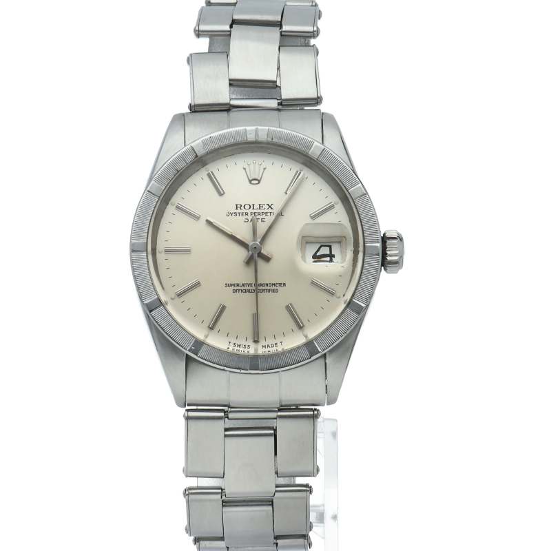 | This is an antique Oyster Perpetual Date 1501. The case size is a little small, but the engine-turned bezel gives it a strong presence. |