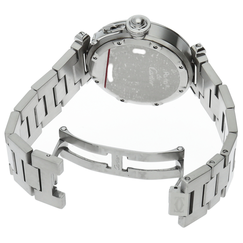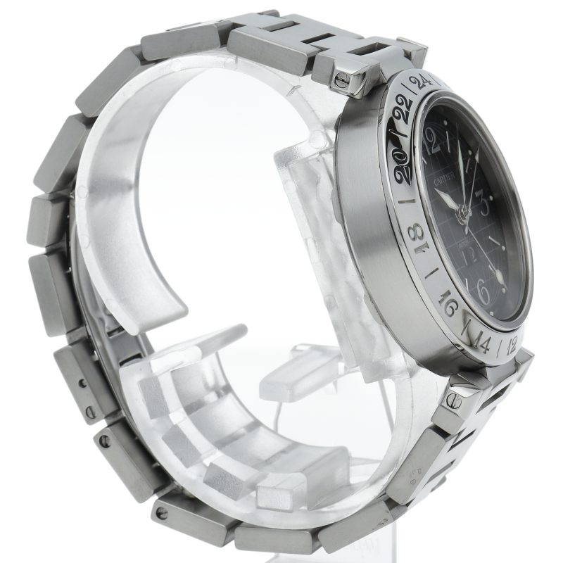 | Cartier Pasha C Meridian (W31049M7). This 1.4" unisex model features a bold black dial that exudes a cool, urban look. Equipped with a GMT function, it perfectly combines practicality with design. The unique shape of the crown protector, contrasting with the black, gives this discontinued masterpiece an intellectual and stylish look. |