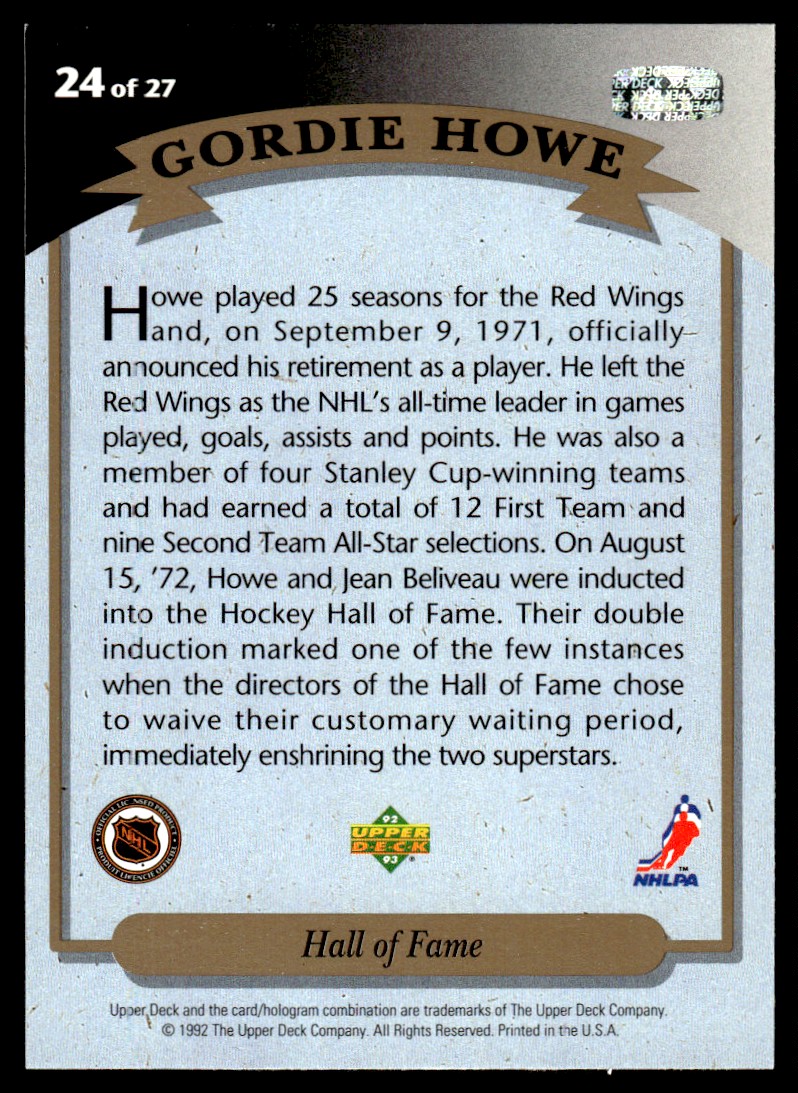 | 1992-93 Upper Deck Hockey Heroes Gordie Howe Gordie Howe Detroit Red Wings #24 |