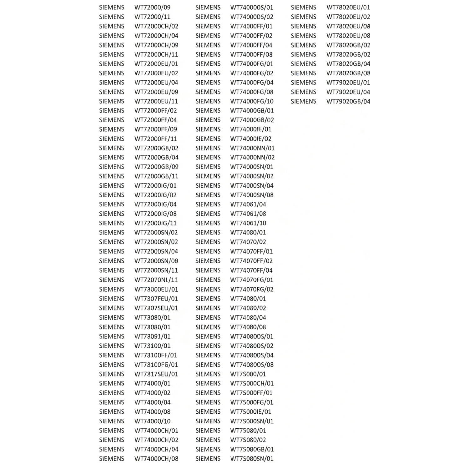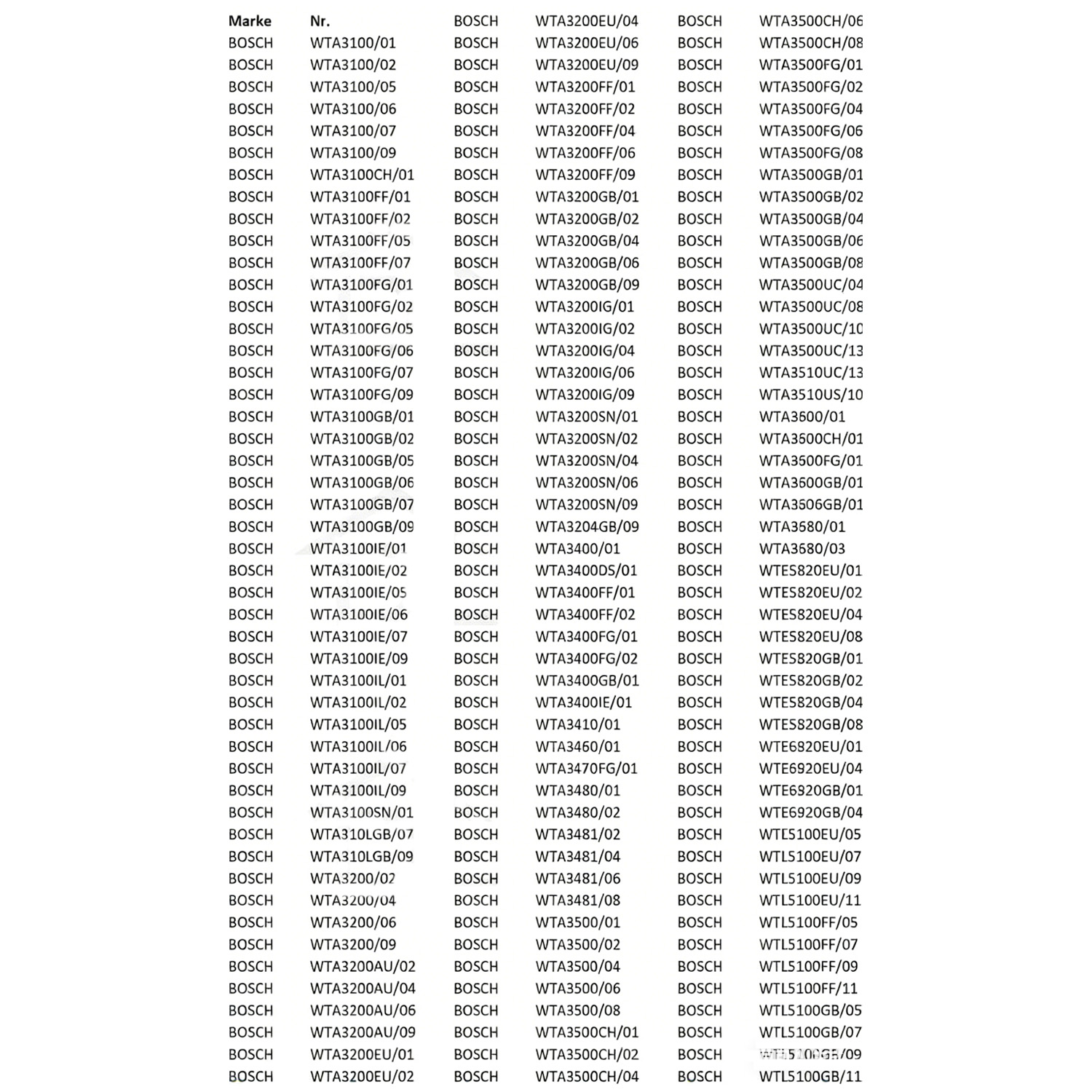 Bosch Exclusiv TA / EXCLUSIVTA WTA3481/06 WTA3481/04 WTA3481/02 WTA3480/02 WTA3480/01 Exclusiv TK / EXCLUSIVTK WTL5380/01 WTL5480DS/01 WTL5481DS/02 WTL5480/02 WTL5481/02 WTL5480/01 WTL5480DS/02 WTL5481/04 WTL5481DS/04 Practica / PRACTICA WTA3460/01 Practica WTL 5460 / PRACTICAWTL5460 WTL5460/01 WTL5460/02 Silence / SILENCE WTL5400GB/04 WTL5400CH/04 WTL5400CH/01 WTL5400GB/01 WTL5400NN/01 Silver Edition / SILVEREDITION WTL527SEU/04 WTL527SSN/04 Winner / WINNER WTA3410/01 WTA 3100 / WTA3100 WTA3100/07 WTA3100IL/06 WTA3100GB/07 WTA3100CH/01 WTA3100IL/02 WTA3100FG/07 WTA3100GB/02 WTA3100/01 WTA3100IL/07 WTA3100GB/06 WTA3100FF/01 WTA3100IL/05 WTA3100FG/06 WTA3100GB/01 WTA3100FF/02 WTA3100IE/07 WTA3100FG/05 WTA3100FF/05 WTA3100IL/01 WTA3100FF/07 WTA3100IE/06 WTA3100FG/02 WTA3100/02 WTA3100FG/01 WTA3100IE/05 WTA3100IE/01 WTA3100/05 WTA3100/06 WTA3100SN/01 WTA3100IE/02 WTA3100GB/05 WTA 310 L / WTA310L WTA310LGB/07 WTA 3200 / WTA3200 WTA3200IG/01 WTA3200IG/04 WTA3200EU/01 WTA3200AU/02 WTA3200GB/04 WTA3200GB/02 WTA3200IG/06 WTA3200SN/04 WTA3200EU/04 WTA3200FF/01 WTA3200EU/02 WTA3200AU/04 WTA3200SN/01 WTA3200SN/06 WTA3200EU/06 WTA3200AU/06 WTA3200SN/02 WTA3200GB/06 WTA3200FF/04 WTA3200GB/01 WTA3200/02 WTA3200IG/02 WTA3200FF/02 WTA3200/06 WTA3200FF/06 WTA3200/04 WTA 3400 / WTA3400 WTA3400FG/02 WTA3400FF/01 WTA3400FF/02 WTA3400GB/01 WTA3400/01 WTA3400FG/01 WTA3400IE/01 WTA3400DS/01 WTA 3470 / WTA3470 WTA3470FG/01 WTA 3500 / WTA3500 WTA3500GB/01 WTA3500CH/01 WTA3500UC/04 WTA3500CH/02 WTA3500CH/06 WTA3500/06 WTA3500CH/04 WTA3500GB/02 WTA3500GB/04 WTA3500/04 WTA3500FG/01 WTA3500GB/06 WTA3500/02 WTA3500FG/04 WTA3500/01 WTA3500FG/02 WTA3500FG/06 WTE 5820 / WTE5820 WTE5820EU/04 WTE5820GB/04 Siehe Gerätenummer / WTE5820EU01 WTE5820EU/01 Siehe Gerätenummer / WTE5820EU02 WTE5820EU/02 Siehe Gerätenummer / WTE5820GB01 WTE5820GB/01 Siehe Gerätenummer / WTE5820GB02 WTE5820GB/02 WTL 5100 / WTL5100 WTL5100IG/05 WTL5100SN/07 WTL5100EU/05 WTL5100FF/07 WTL5100GB/07 WTL5100FF/05 WTL5100GB/05 WTL5100IG/07 WTL5100EU/07 WTL5100SN/05 WTL 5200 / WTL5200 WTL5200EU/02 WTL5200FF/02 WTL5200/02 WTL5200FF/04 WTL5200IG/04 WTL5200/04 WTL5200IG/01 WTL5200IG/02 WTL5200AU/04 WTL5200GB/02 WTL5200SN/01 WTL5200CH/02 WTL5200SN/04 WTL5200CH/04 WTL5200SN/02 WTL5200EU/01 WTL5200EU/04 WTL 5201 / WTL5201 WTL5201GB/04 WTL 527S / WTL527S WTL527SGB/04 WTL 5300 / WTL5300 WTL5300EU/01 WTL 5400 / WTL5400 WTL5400DS/01 WTL5400CH/02 WTL5400SN/02 WTL5400FG/01 WTL5400SN/04 WTL5400/04 WTL5400UC/04 WTL5400GB/02 WTL5400FF/04 WTL5400IE/01 WTL5400FF/01 WTL5400/01 WTL5400IE/02 WTL5400FF/02 WTL5400FG/04 WTL5400DS/02 WTL5400/02 WTL5400NN/02 WTL5400SN/01 WTL5400FG/02 WTL 5470 / WTL5470 WTL5470FF/02 WTL5470FG/02 WTL5470FG/01 WTL5470/01 WTL5470/02 WTL5470FF/01 WTL5470FF/04 Constructa CT 4600 / CT4600 CT46000IL/02 CT46000IL/01 CT46000/02 CT46000/01 CT 4700 / CT4700 CT47000/02 CT47000/06 CT47000/04 CT 4800 / CT4800 CT48000/02 CT48000/01 CT 6200 / CT6200 CT62000/04 CT62000/02 CT 6400 / CT6400 CT64000/01 CT64000/02 CT 6407 / CT6407 CT64070/01 CT64070/02 Neff TV 60 / TV60 R4380X0EU/02 R4380X0EU/04 Siemens Extraklasse 610 / EXTRAKLASSE610 WT6100VGB/11 Extraklasse Champion / EXTRAKLASSECHAMPION WT73090/01 Extraklasse TA / EXTRAKLASSETA WT64080/04 WT64080/06 WT64080IE/01 WT64080/01 WT64080IE/02 WT64080/02 Extraklasse TK / EXTRAKLASSETK WT74080/04 WT74080/01 Extraklasse TK Edition / EXTRAKLASSETKEDITION WT73091/01 Extraklasse TK Serie IQ / EXTRAKLASSETKSERIEIQ WT74080/02 WT74080DS/04 WT74080DS/02 WT73080/01 WT74080DS/01 Optima 640 / OPTIMA640 WT64061/06 WT64061/04 Optima 740 / OPTIMA740 WT74061/04 Siwatherm 6100 / SIWATHERM6100 WT61000IL/01 WT61000IE/05 WT61000EE/05 WT61000/01 WT61000IE/06 WT61000GB/01 WT61000GB/06 WT61000GB/05 WT61000FF/05 WT61000GB/07 WT61000IL/05 WT61000FG/06 WT61000SN/01 WT61000FG/05 WT61000FG/01 WT61000FG/07 WT61000/07 WT61000SN/05 WT61000IE/01 WT61000/05 WT61000IE/07 WT61000FF/01 WT61000/06 Siwatherm 6400 / SIWATHERM6400 WT64000FG/01 WT64000FF/01 WT64000DS/01 WT64000/01 Siwatherm 6407 / SIWATHERM6407 WT64070FG/01 WT64070/01 Siwatherm 6500 / SIWATHERM6500 WT65000CH/01 WT65000/01 WT65000CH/02 WT65000/02 WT65000CH/04 WT65000FG/01 WT65000/04 WT65000FG/02 WT65000CH/06 WT65000/06 WT65000FG/04 WT65000FG/06 Siwatherm 7100 / SIWATHERM7100 WT71000SN/05 WT71000FF/05 WT71000EU/05 WT71000FF/07 WT71000IG/07 WT71000IG/05 WT71000SN/07 WT71000EU/07 Siwatherm 7300 / SIWATHERM7300 WT73000EU/01 Siwatherm 7400 / SIWATHERM7400 WT74000DS/01 WT74000SN/04 WT74000/01 WT74000SN/01 WT74000DS/02 WT74000/02 WT74000SN/02 WT74000/04 WT74000NN/01 WT74000FG/02 WT74000FF/02 WT74000CH/01 WT74000NN/02 WT74000GB/02 WT74000CH/02 WT74000GB/01 WT74000CH/04 WT74000IE/02 Siwatherm 7400 Serie IQ / SIWATHERM7400SERIEIQ WT74000IE/01 WT74000FF/01 WT74000FG/04 WT74000FF/04 WT74000FG/01 Siwatherm 7407 / SIWATHERM7407 WT74070FG/01 WT74070FG/02 WT74070FF/02 WT74070FF/04 WT74070/02 WT74070FF/01 WT74070/01 Siwatherm 7802 / SIWATHERM7802 WT78020GB/01 WT78020GB/04 WT78020EU/01 WT78020EU/02 WT78020EU/04 WT78020GB/02 Siwatherm C / SIWATHERMC WT72000IG/02 Siwatherm C 6 / SIWATHERMC6 WT62000/02 WT62000IG/06 WT62000EU/01 WT62000GB/02 WT62000FF/04 WT62000SN/04 WT62000/04 WT62000EU/04 WT62000IG/02 WT62000FF/06 WT62000EU/02 WT62000GB/04 WT62000SN/02 WT62000CH/02 WT62000IG/04 WT62000FF/01 WT62000CH/06 WT62000/06 WT62000SN/01 WT62000CH/04 WT62000IG/01 WT62000FF/02 WT62000GB/06 WT62000EU/06 WT62000GB/01 WT62000SN/06 Siwatherm C 7 / SIWATHERMC7 WT72000SN/01 WT72000EU/01 WT72000/04 WT72000IG/01 WT72000/02 WT72000FF/04 WT72000GB/04 WT72000CH/04 WT72000IG/04 WT72000CH/02 WT72000FF/02 WT72000SN/04 WT72000EU/04 WT72000SN/02 WT72000GB/02 WT72000EU/02 Suprema / SUPREMA WT61000EE/01 Suprema 6100 / SUPREMA6100 WT61000EE/02 WT 6100 / WT6100 WT61000IL/02 WT61000/02 WT61000GB/02 WT61000FF/02 WT61000FG/02 WT61000SN/02 WT61000IE/02