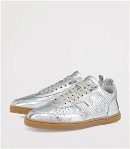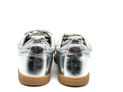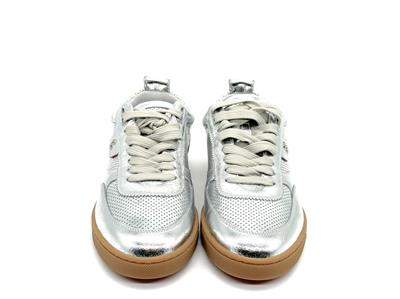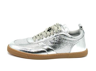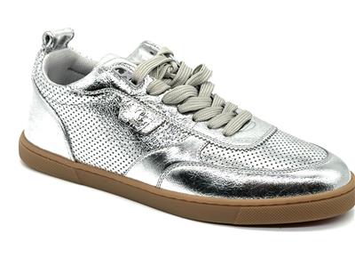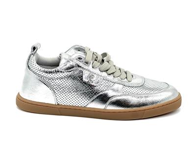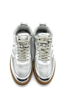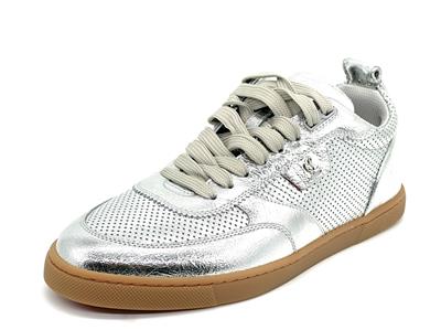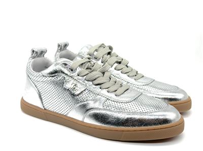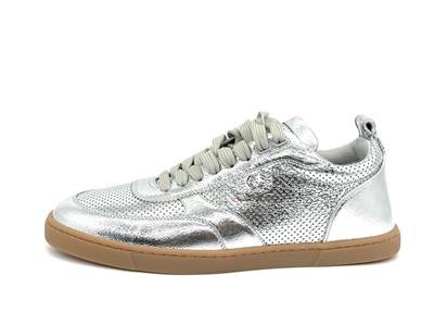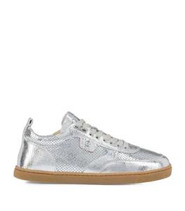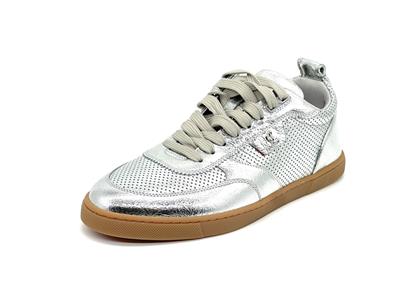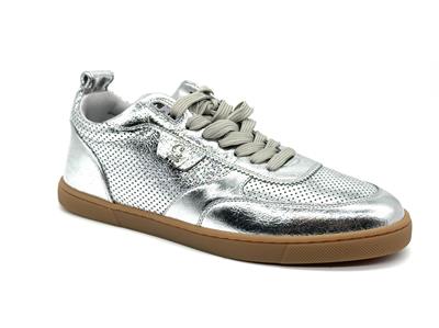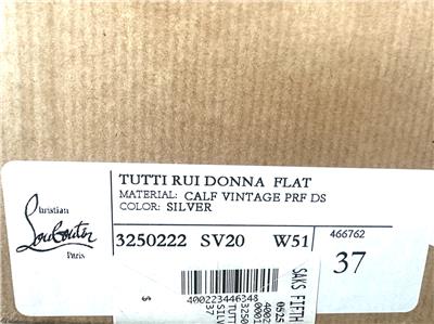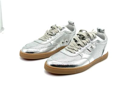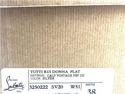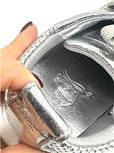 The Christian Louboutin 'Tutti Rui Donna' are low-top sneakers in perforated metallic silver calf leather. These sneakers feature a flat heel, round toe, and lace-up style. They have a cushioned footbed, signature red rubber outsole, and leather lining. Made in Italy.