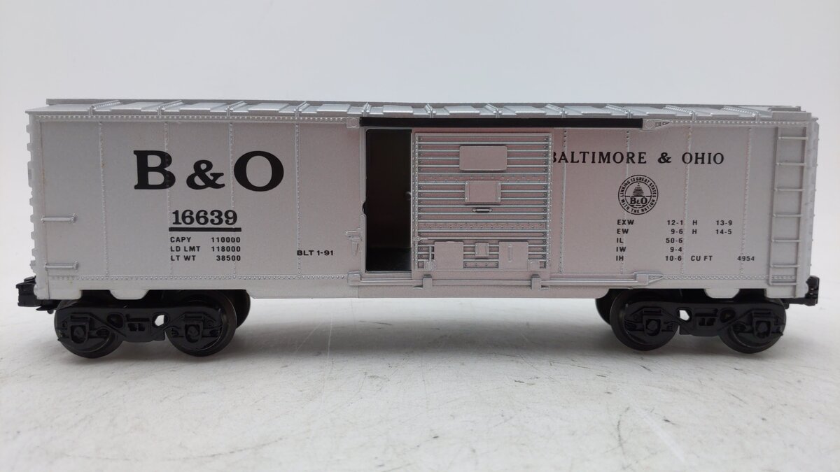 Here is a Lionel 6-16639 O Gauge Baltimore & Ohio W/Steam Railroad sounds. This boxcar features a durable plastic shell, sliding doors, operating knuckle couplers, and metal wheels. It has steam sounds, including chuffing, whistle and bell. The sound activation button is not included.