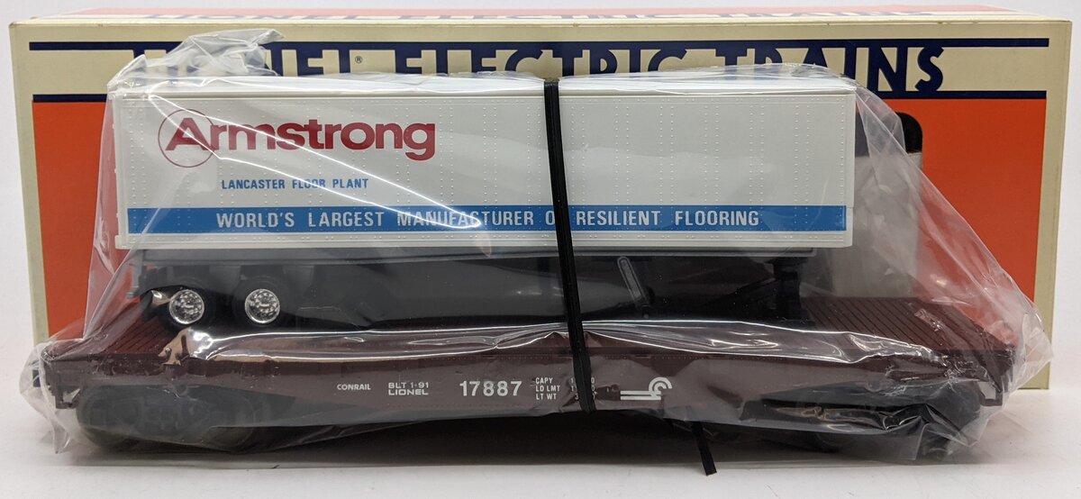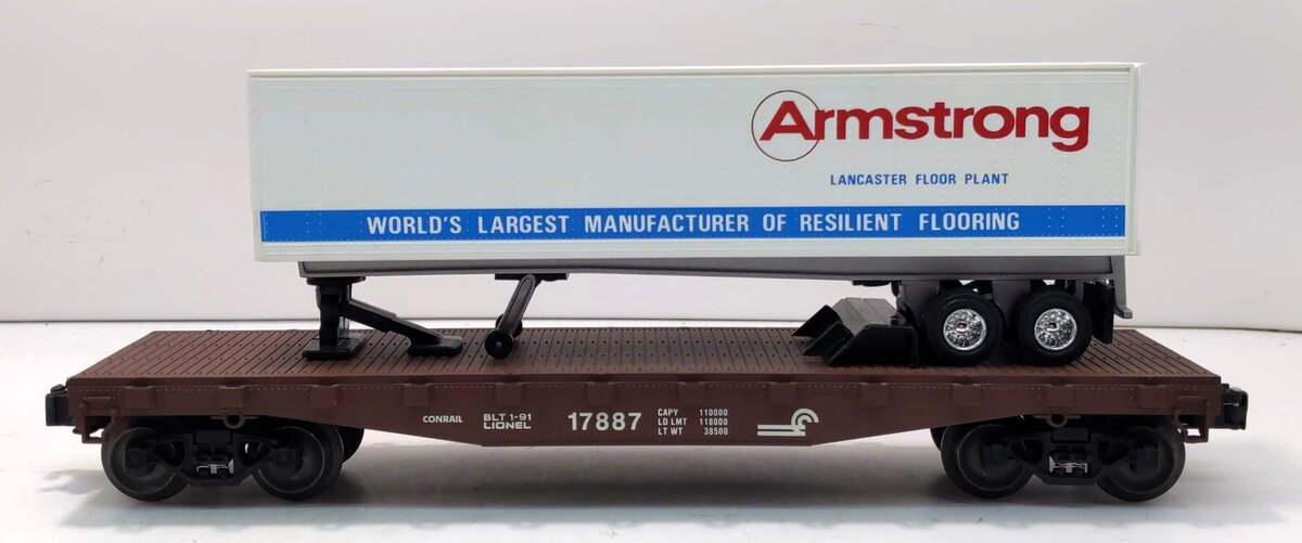 Here is a Lionel 17887 O Gauge LCCA Convention Conrail Flatcar with an Armstrong Trailer. The flatcar features a durable plastic construction with an Armstrong trailer, die-cast metal sprung trucks, die-cast metal operating knuckle couplers, metal wheels and axles, and attractive decoration.