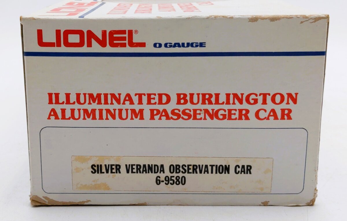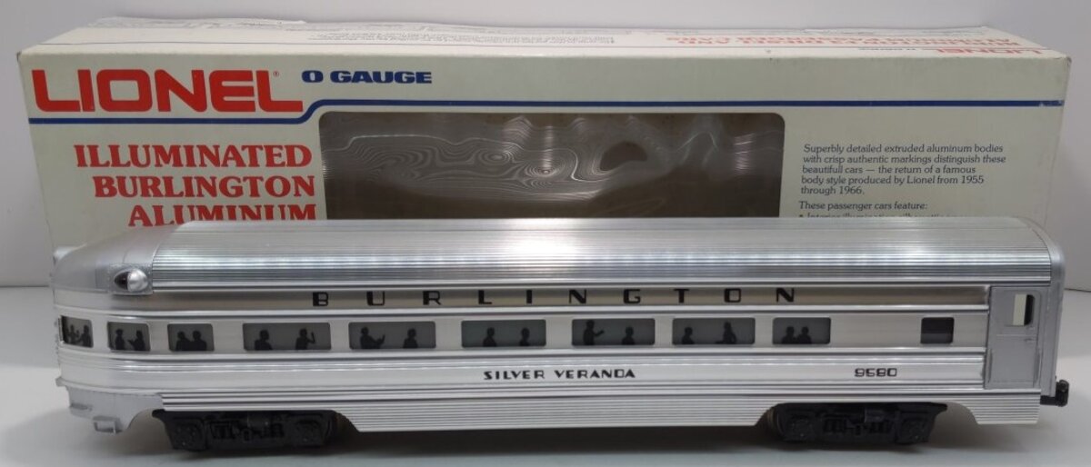 Here is a Lionel 6-9580 O Gauge Burlington Aluminum "Silver Veranda" Observation Car. This car is part of the Burlington Texas Zephyr set from 1980. It features an aluminum body, an illuminated interior with passenger silhouetted windows, die-cast trucks with operating metal couplers, and it is 15 inches long.