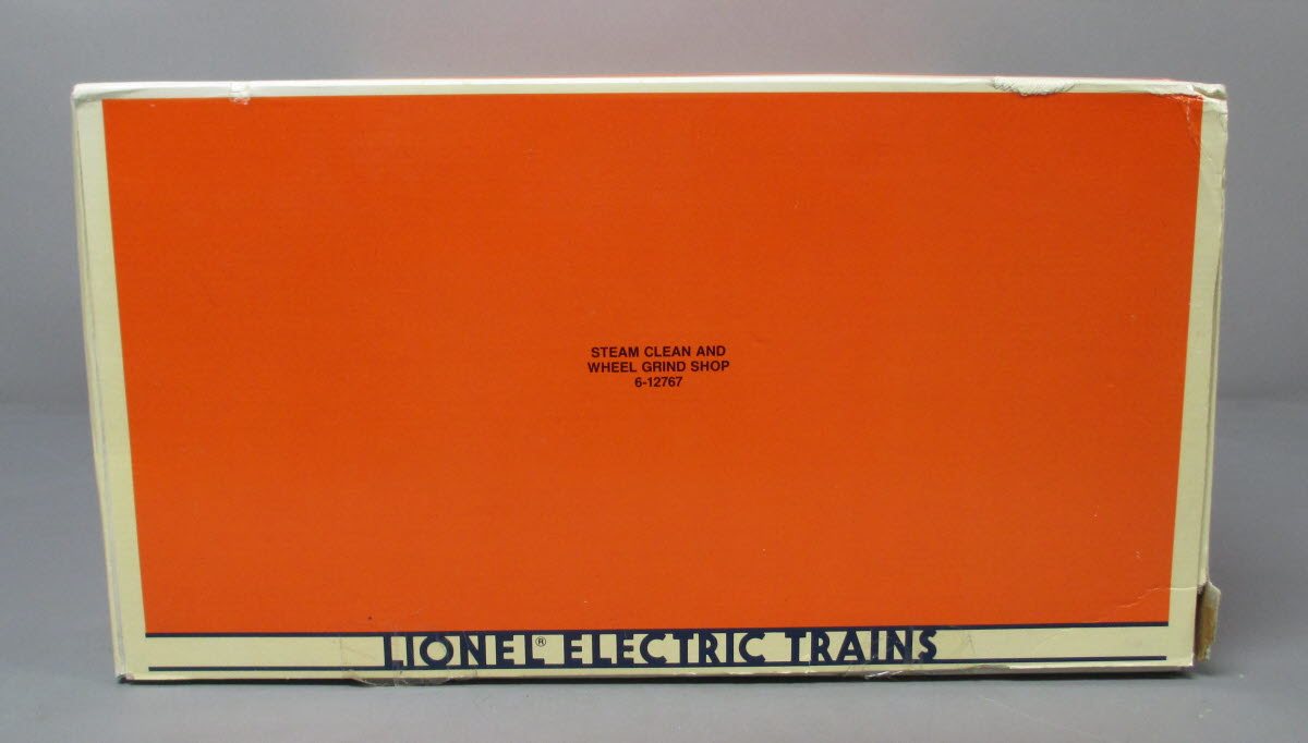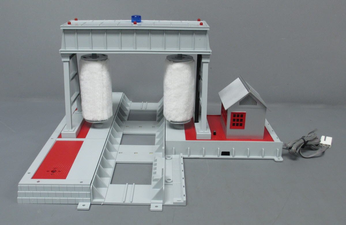 This is a Lionel 6-12767 O Gauge Steam Clean & Wheel Grind Shop. Features include plastic and metal construction with illumination. As the engine passes through the accessory blows smoke to simulate the steam cleaning of the engine and a covered grinder mechanism throws sparks to simulate the grinding of the locomotive's wheels. Pretty neat! The accessory measures approximately 2 feet square.