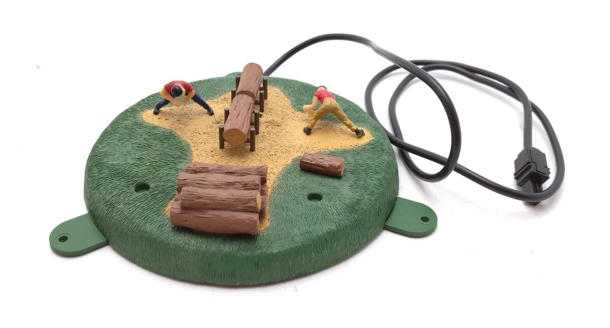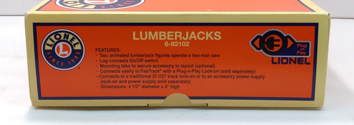 This is a Lionel 6-82102 O Operating Lumberjacks. Working by hand, these lumberjacks push and pull the saw back and forth through the log. This compact operating accessory can fit on just about any layout. Plug-N-Play Accessory: Connects easily to FasTrack with a Plug-n-Play Lock-on (sold separately), connects to a traditional O/ O27 track lock-on or to an accessory power supply (lock-on and power supply sold separately), can be upgraded to command control with the purchase of a SC-2 Switch Controller or an ASC2 (both sold separately). Features includes two animated lumberjack figures operate a two-man saw, log conceals On/Off switch, mounting tabs to secure accessory to layout (optional).