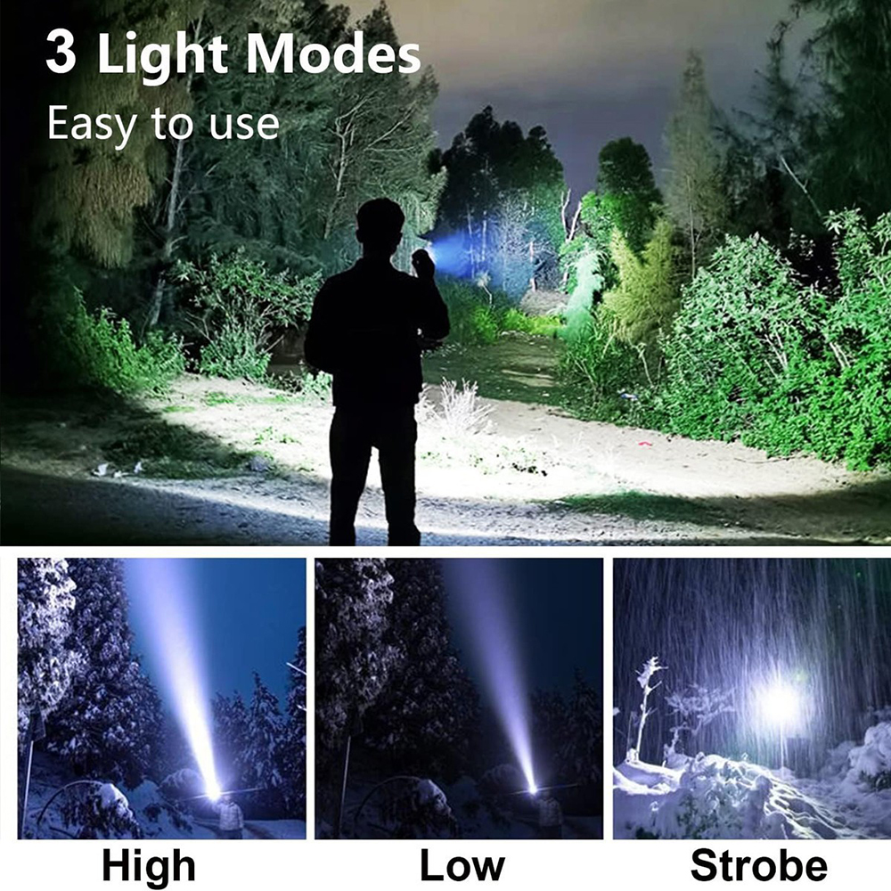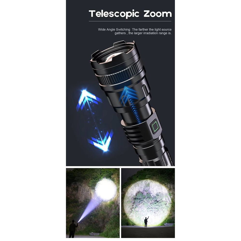 Equipped with an upgraded P50 LED chip, this high-performance flashlight delivers an impressive beam distance of up to 2624 ft (800 m). Ideal for emergencies, outdoor adventures, camping, or everyday use. The adjustable zoom function allows easy switching between spotlight and floodlight modes.