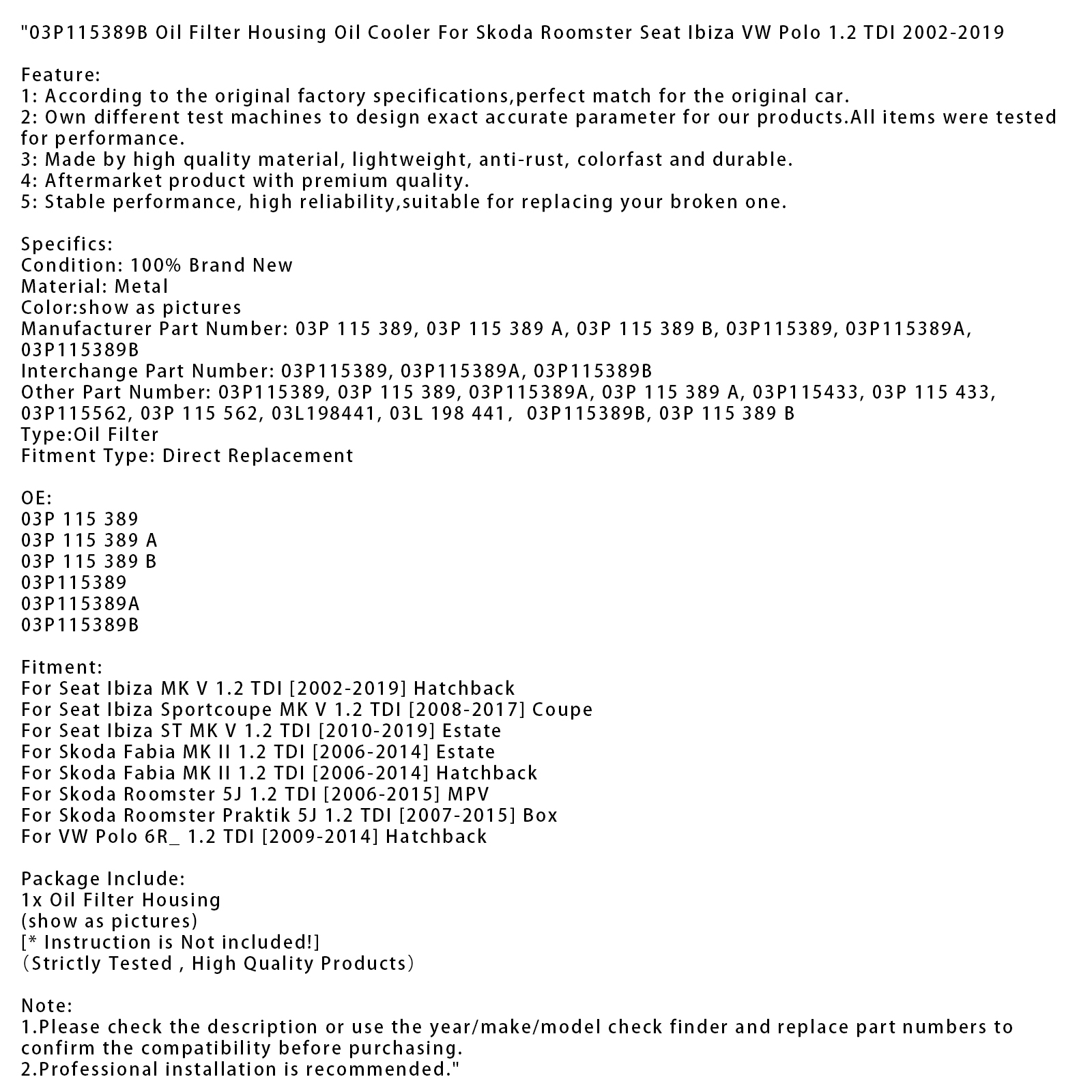 03P115389B Oil Filter Housing Oil Cooler For Skoda Roomster Seat Ibiza VW Polo 1.2 TDI 2002-2019