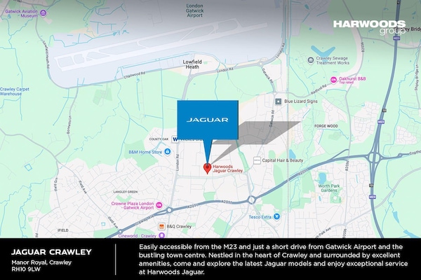 Our Jaguar Crawley dealership was acquired in 2012 and is located on Manor Royal, Crawley, making it easily accessible. Here at Harwoods Group, we like to make sure that our customers are treated with the upmost satisfaction when they visit our Crawley site! Here we offer both Jaguar sales and aftersales, covering Crawley, Gatwick, Reigate and Dorking. We have a wide range of new cars available, with models including the Jaguar XF, the Jaguar F-TYPE and the all-electric Jaguar I-PACE. You can view our selection of approved used Jaguar cars, such as the Jaguar F-PACE and the Jaguar XF Sportbrake.