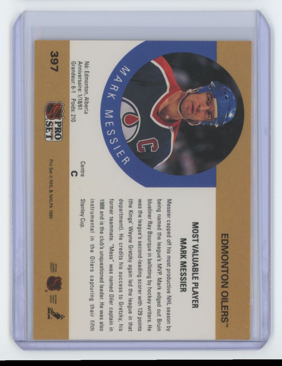 | Description: | Mark Messier | | Category: | Hockey | | Year: | 1990 | | Product: | NHL Pro Set | | Team: | Edmonton Oilers | | Card Number: | 397 | | Memorabilia: | . | | Special: | | | Dimensions: | 4" x 3" |