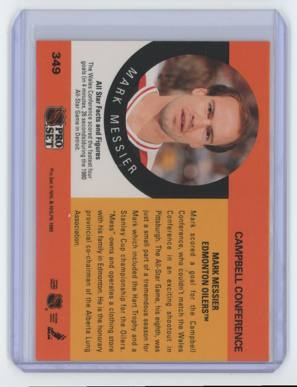 | Description: | Mark Messier | | Category: | Hockey | | Year: | 1990 | | Product: | Pro Set NHL | | Team: | Edmonton Oilers | | Card Number: | 349 | | Memorabilia: | . | | Special: | | | Dimensions: | 4" x 3" |