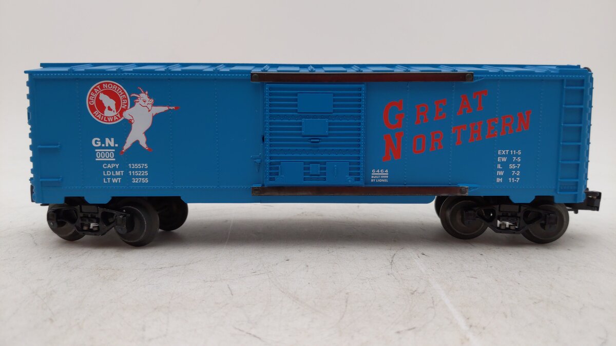 Here is a Lionel 6-29284 O Gauge Great Northern Boxcar #0000 from 1999. Features include opening doors, metal door guides, die-cast metal sprung trucks, magnetic couplers and metal wheels and axles.