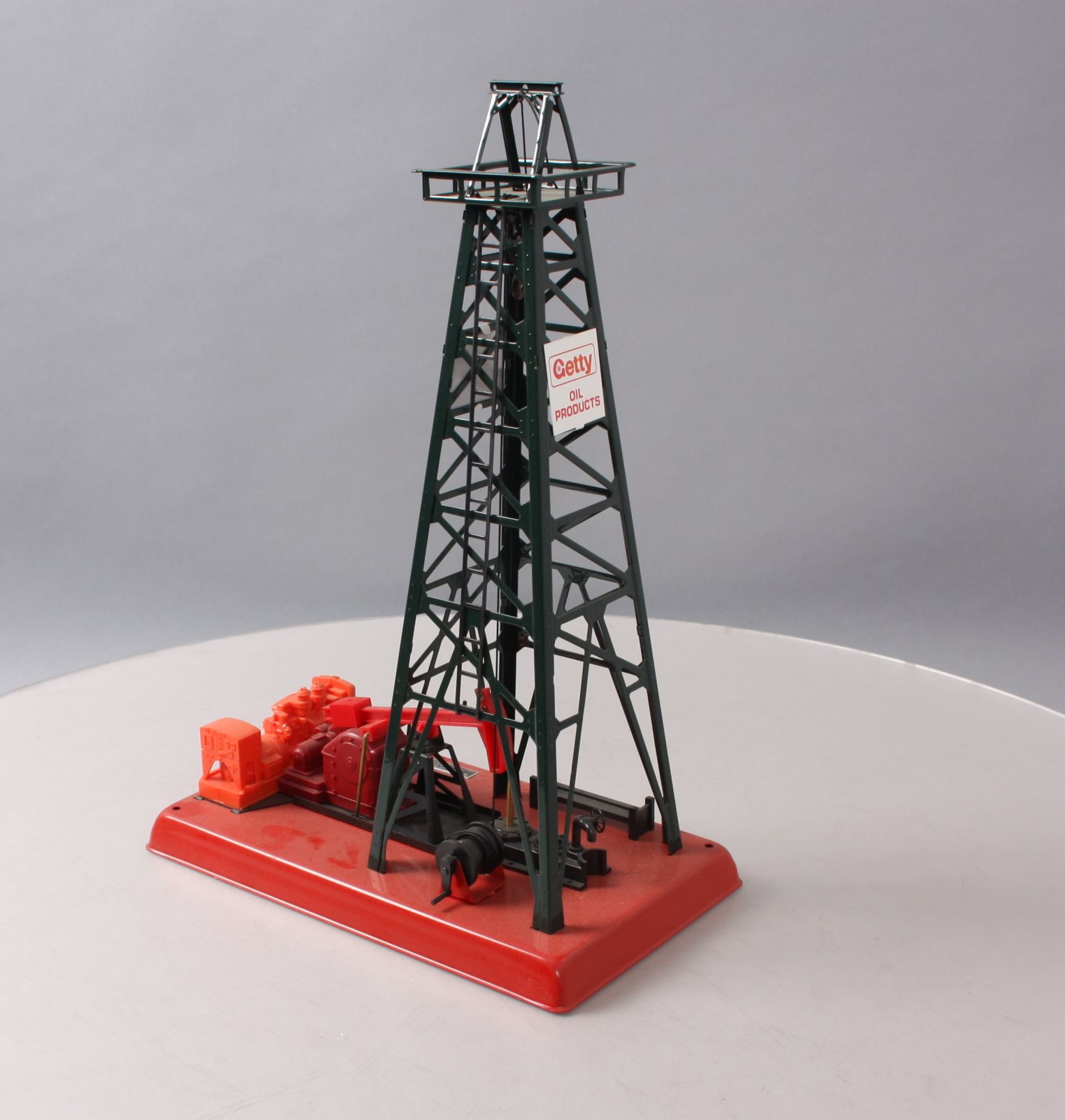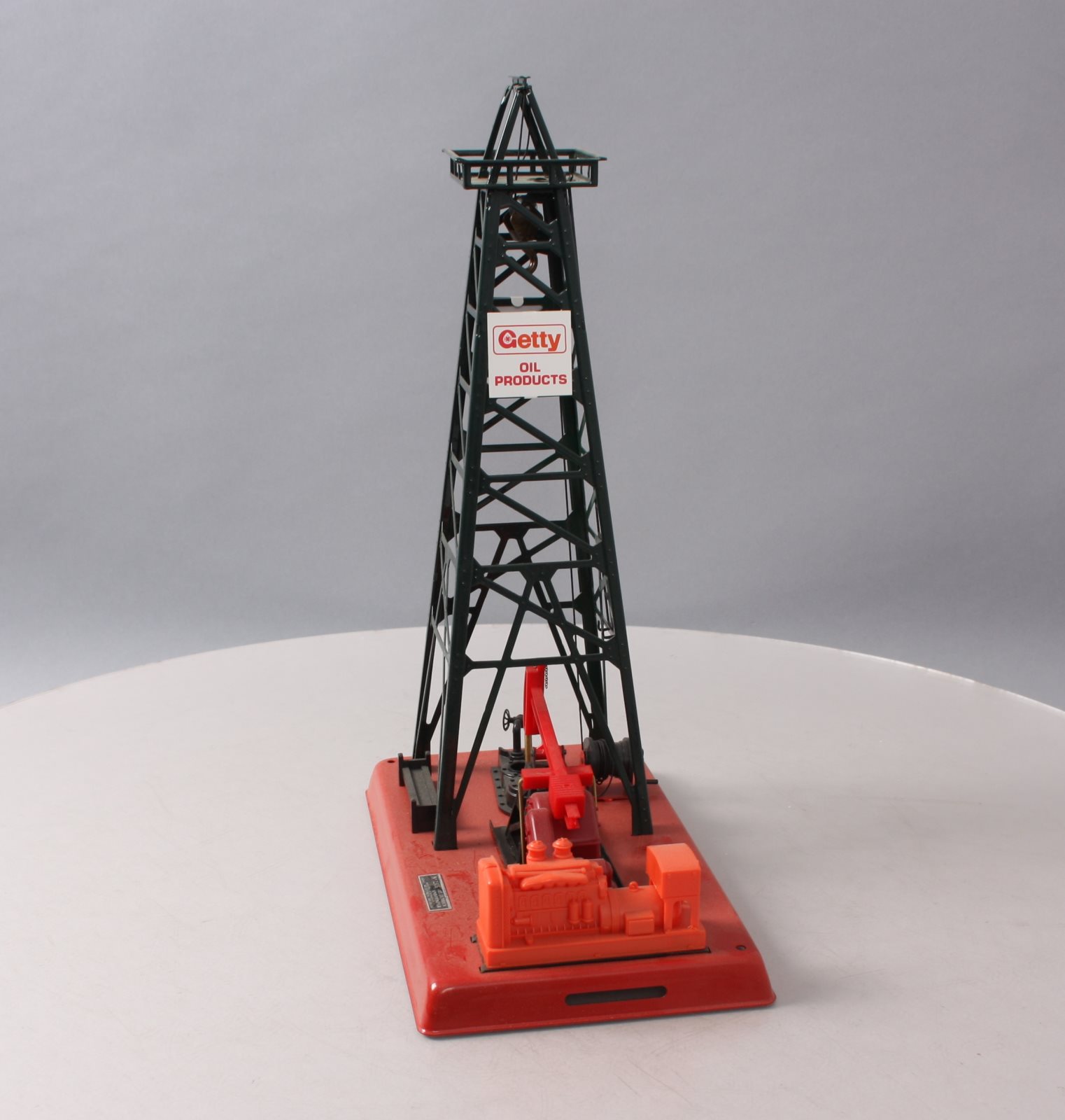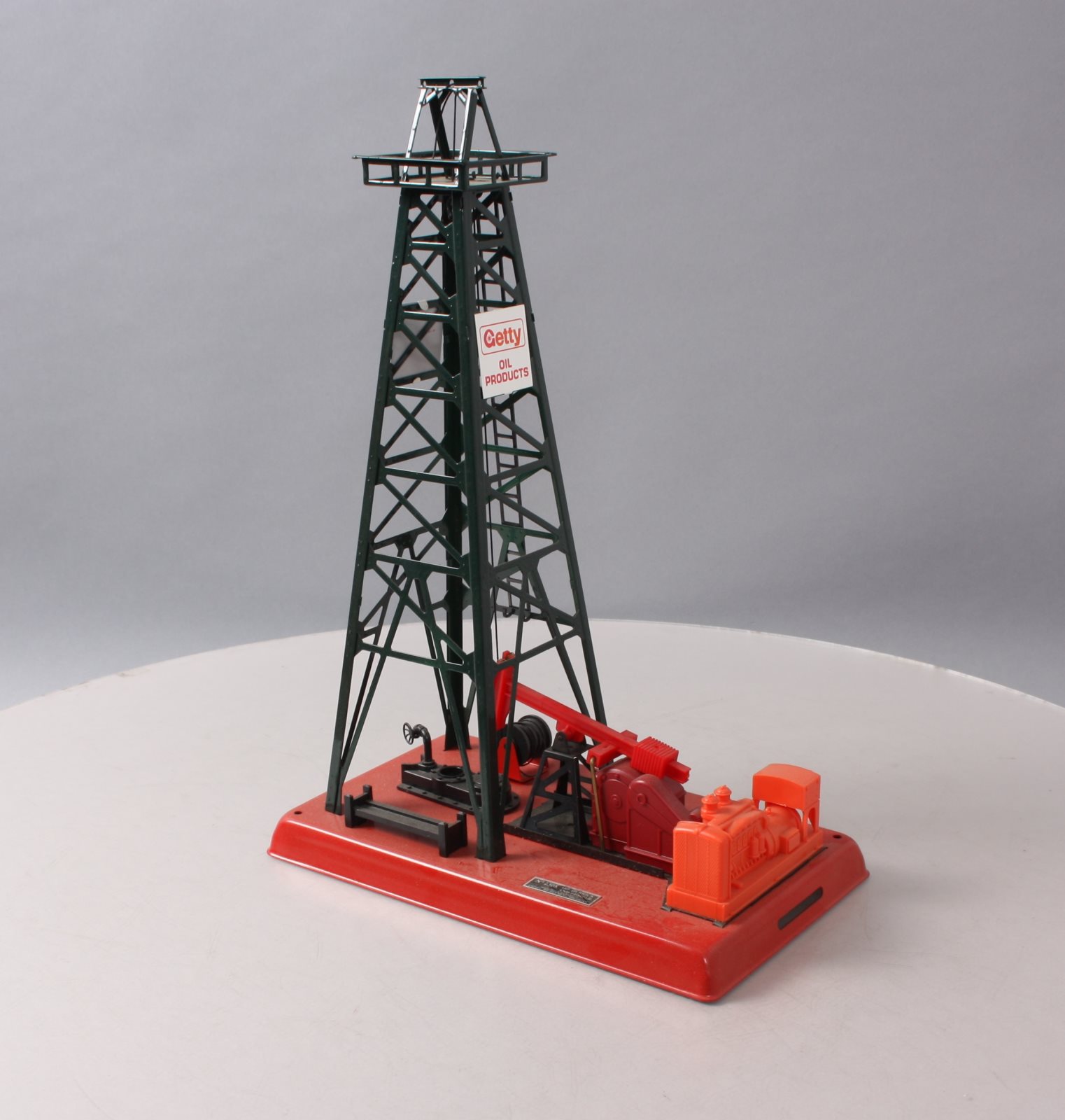 Here is a Lionel 6-2305 O Gauge Getty Operating Oil Derrick And Pump built by Lionel Trains in Mt. Clemons, Michigan. It features a working beam on pump that moves up and down, an illuminated glass bubbling pipe, and a metal (simulated steel) derrick and base. It measures approximately 9.75" inches long, 5.5" inches wide, and 14.5" inches in height.