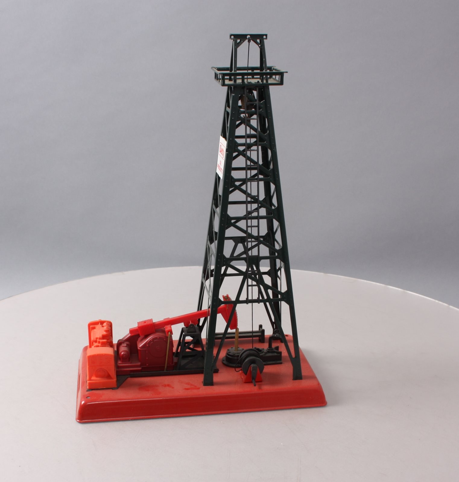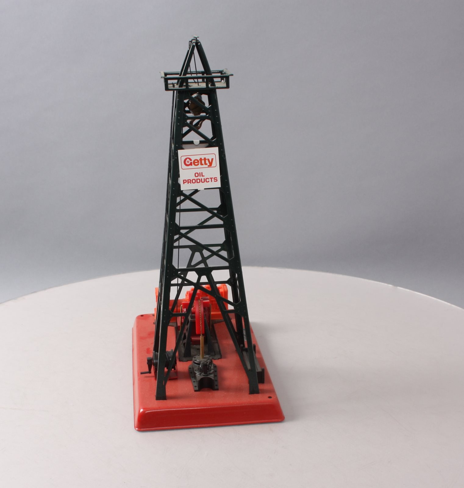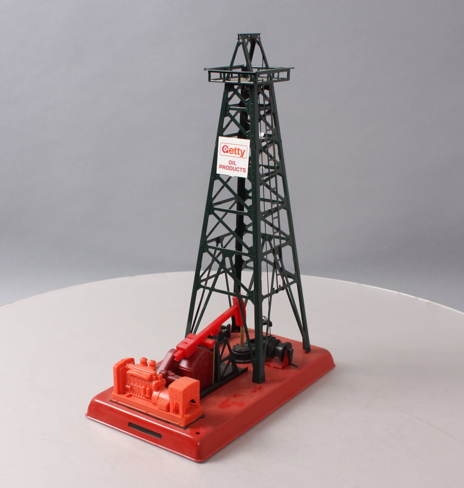 Here is a Lionel 6-2305 O Gauge Getty Operating Oil Derrick And Pump built by Lionel Trains in Mt. Clemons, Michigan. It features a working beam on pump that moves up and down, an illuminated glass bubbling pipe, and a metal (simulated steel) derrick and base. It measures approximately 9.75" inches long, 5.5" inches wide, and 14.5" inches in height.