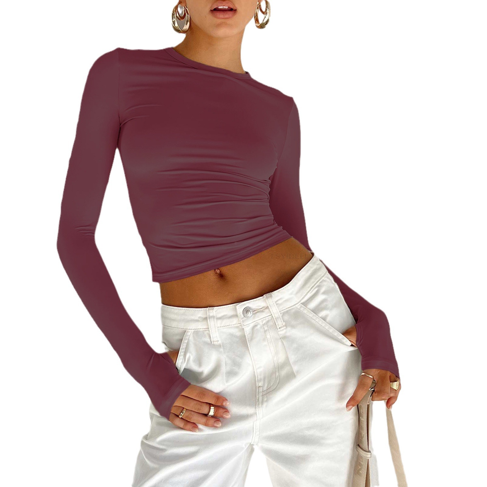 Women's new T-shirt fashionable slim fit solid color round neck base shirt top