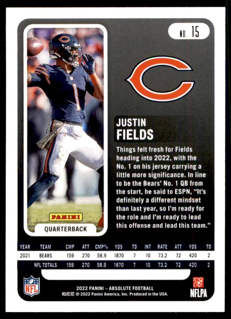 | Description: | Justin Fields | | Category: | Football | | Year: | 2022 | | Product: | Panini Absolute! | | Team: | Chicago Bears | | Card Number: | 15 | | Dimensions: | 3½" x 2½" |