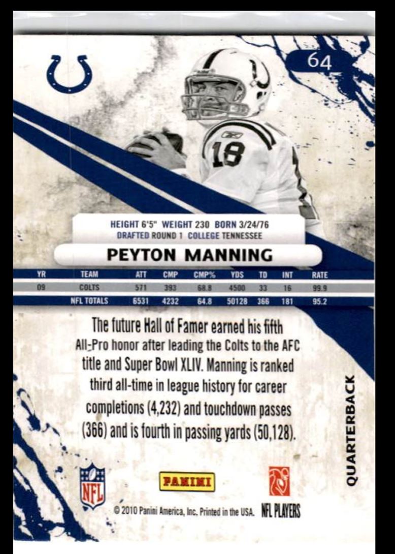 | Description: | Peyton Manning | | Category: | Football | | Year: | 2010 | | Product: | Panini Certified | | Team: | Indianapolis Colts | | Card Number: | 64 | | Dimensions: | 3½" x 2½" |