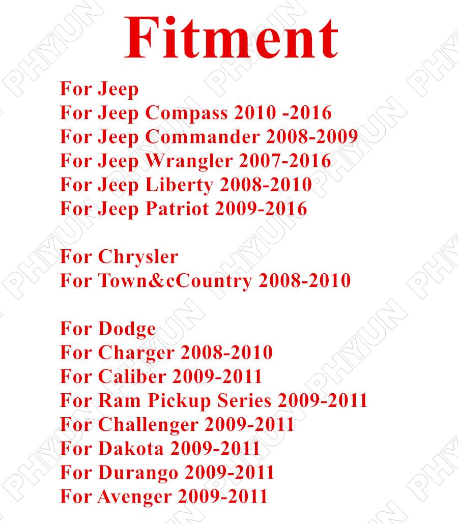 | Fitment | - For Jeep For Jeep Compass 2010 -2016 For Jeep Commander 2008-2009 For Jeep Wrangler 2007-2016 For Jeep Liberty 2008-2010 For Jeep Patriot 2009-2016 - For Chrysler For Town&cCountry 2008-2010 - For Dodge For Charger 2008-2010 For Caliber 2009-2011 For Ram Pickup Series 2009-2011 For Challenger 2009-2011 For Dakota 2009-2011 For Durango 2009-2011 For Avenger 2009-2011 |