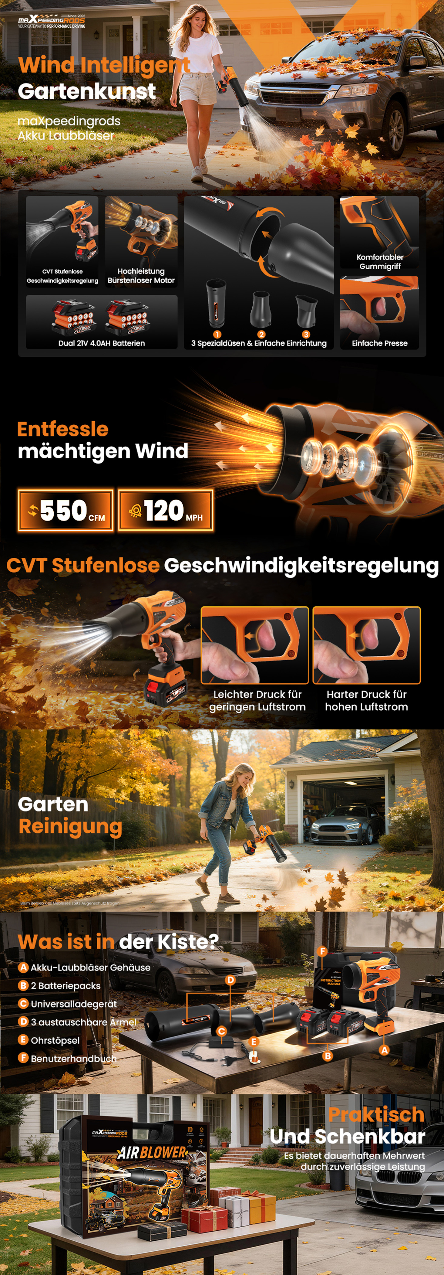 maXpeedingrods Akku Gebläse 21V 4000mAh 550CFM Bürstenlos 32000 U/min Laubbläser