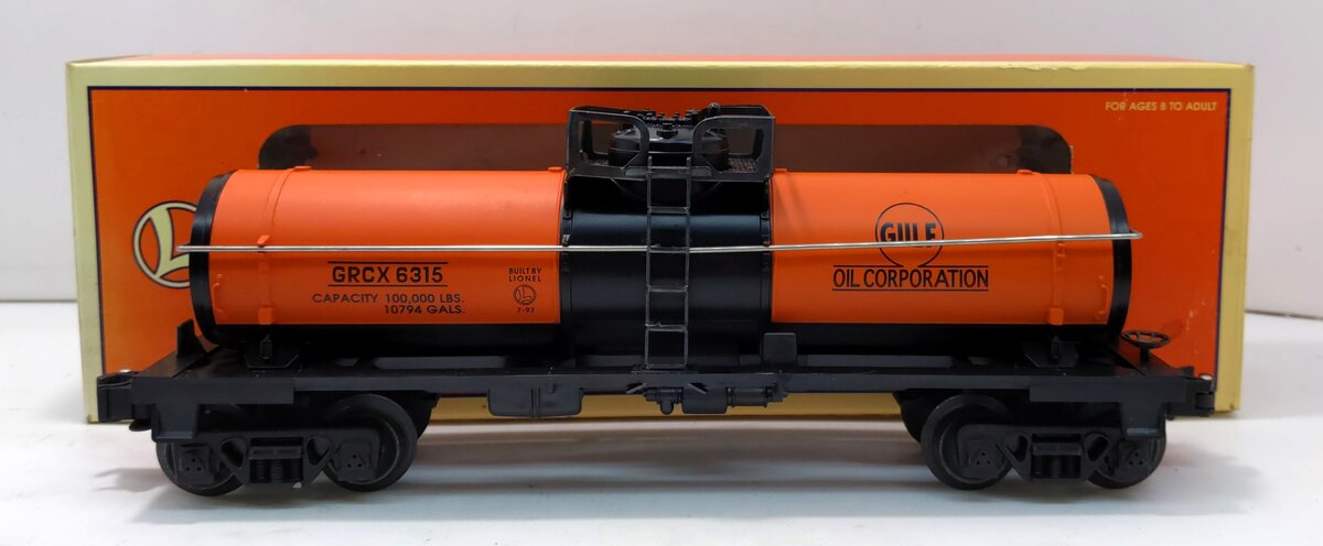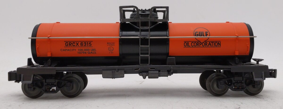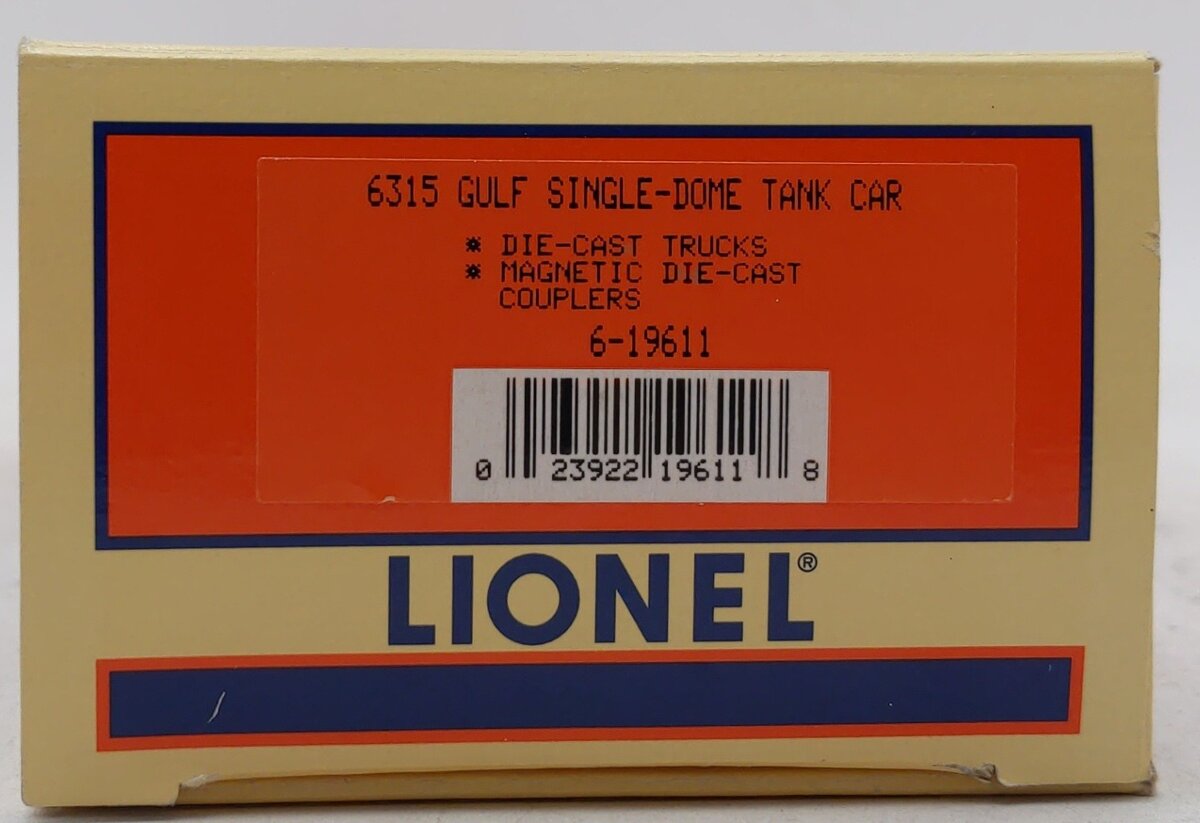 Here is a Lionel 6-19611 O Gauge Gulf Single Dome Tank Car #6315 from 1998. This car features a durable plastic construction with separately applied trim parts, die-cast metal sprung trucks, metal wheels and axles, and die-cast metal operating knuckle couplers.