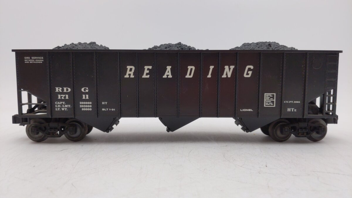 Here is a Lionel 6-17111 O Gauge Reading 3-Bay Hopper with Coal Load. This scale-sized hopper features die-cast metal sprung trucks, die-cast metal operating knuckle couplers, metal wheels and axles.