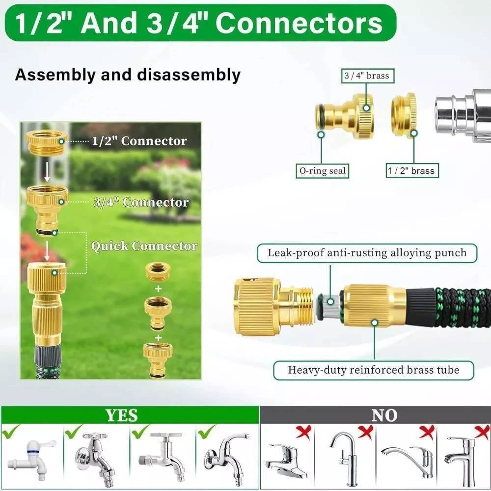 💯Durable Water Hose - Expandable garden hose is made of the high-quality materials. Solid 3/4 Inches brass connectors, rubber washer, sturdy on/off valve, zinc alloy spray nozzle, extra-flexible 3750D polyester fabric cover; Stretchable designed strong expandable garden hose will withstand burst and leaks.