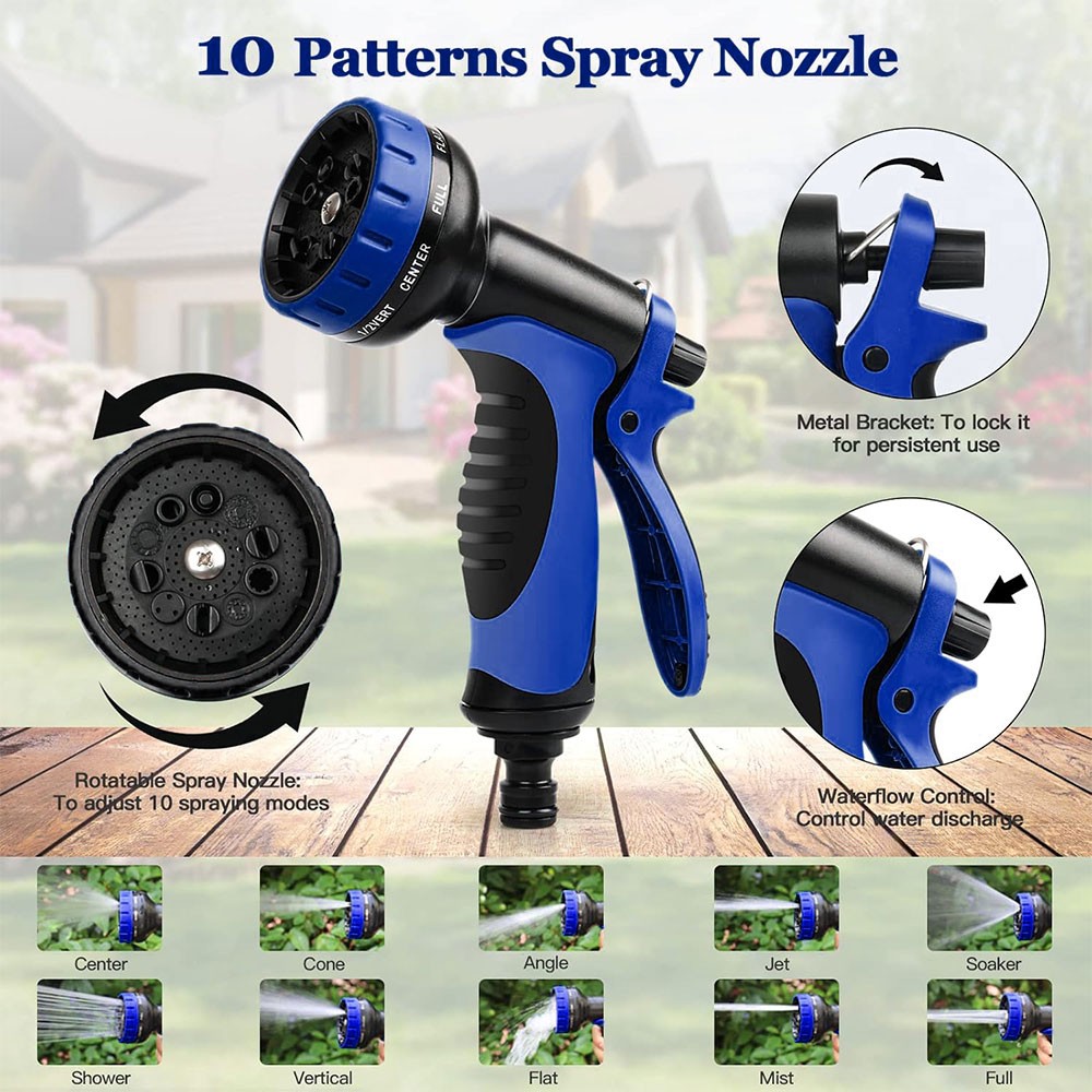 💯Hose with 10 Function Spray Nozzle -garden hose is designed with 10 styles hose spray, this high-pressure garden hose is universal for all kinds of garden watering jobs. Watering the garden plants and flowers, washing the car, taking a bath for your pet or cleaning outdoor windows in a simple way!