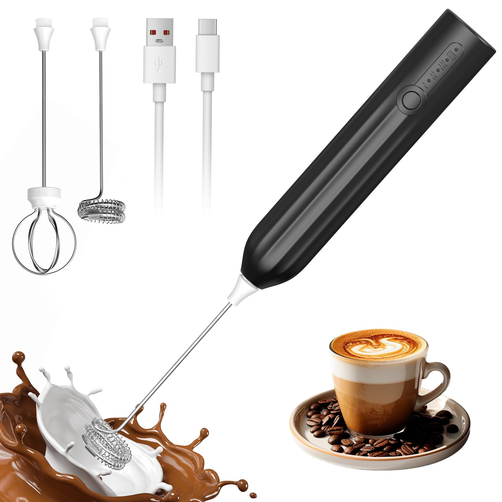The built-in battery capacity is 2300mAh, this portable USB-C rechargeable milk frother provides up to 3 months of usage on a single charge, which is more environmentally friendly and lighter than battery type.This electric milk frother with double whisk allows you to seamlessly adjust the frothing speed with unparalleled precision, ranging from 4500RPM to 10000RPM.Press the power button once to start frothing milk instead of holding the button all the time.The coffee foam maker wand is made of food-grade ABS with an easy and comfortable grip an ergonomic handle and buttons.3 adjustable whisk speeds. Low speed is used for stirring egg yolks, egg whites, and powdered drinks. Medium speed is used for making jam, matcha, and baby food. High speed is used to stir milk or coffee foam, fluffy whipped cream. 2 interchangeable whisks: Spring whisk for frothing milk and coffee and making delicious drink,Balloon whisk for mixing eggs and whipping cream.This Stepless Speed Control milk frother easy to use yet very easy to clean