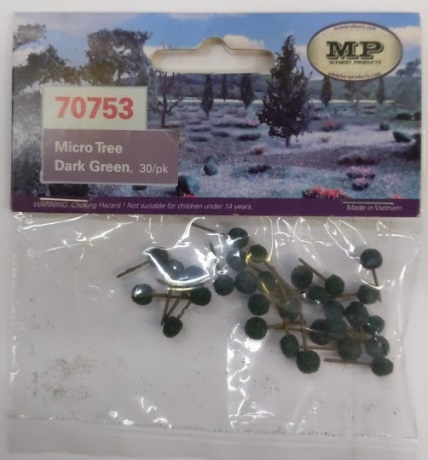This is a MP Scenery Products 70753 Micro Tree Dark Green (Pack of 30).