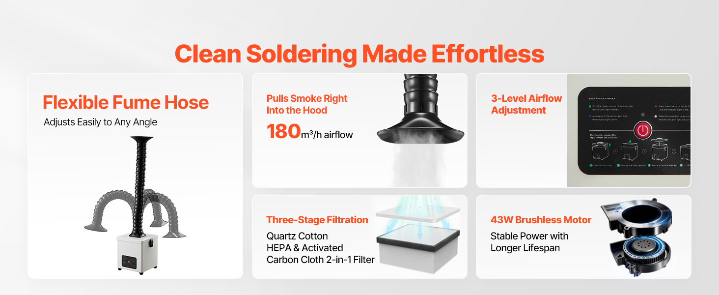 - Aspirazione efficace: questo estrattore di fumi di saldatura è dotato di un motore brushless da 43 W che garantisce una capacità di aspirazione fino a 180 m³/h. È progettato per raccogliere in modo efficiente fumi di saldatura, particelle sottili e polvere.